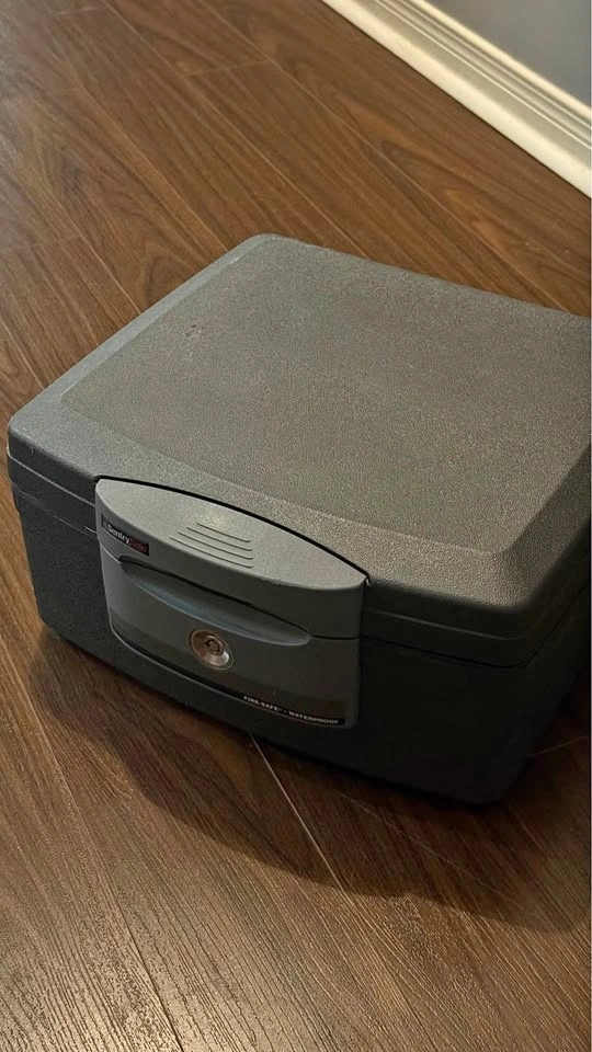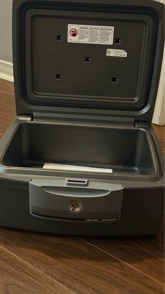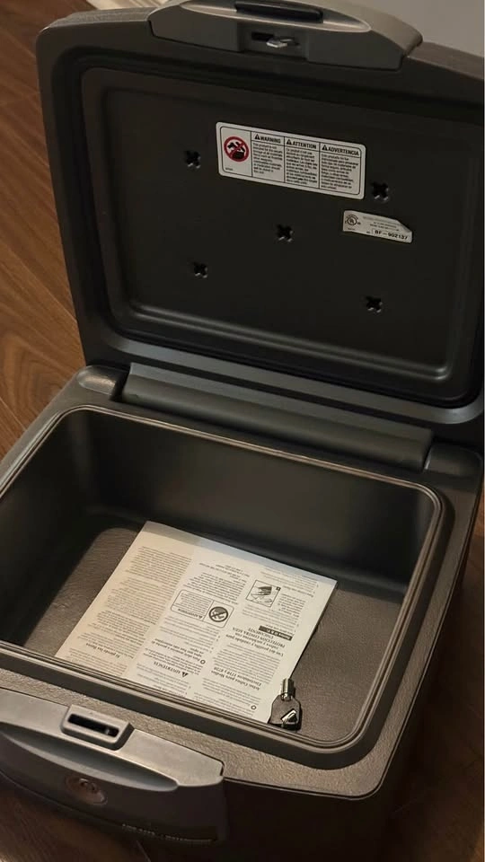 Fire-resistant lock box for documents, passports and valuables. Compact and easy to store at home. Great for keeping important papers safe. Includes key. Pickup in Stouffville.
