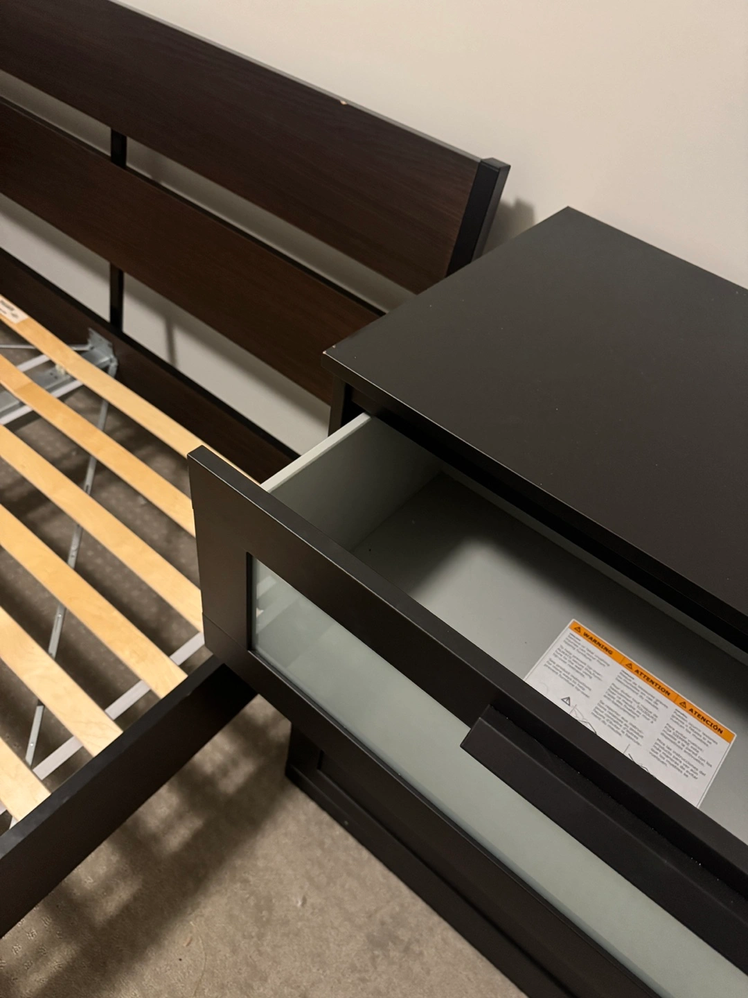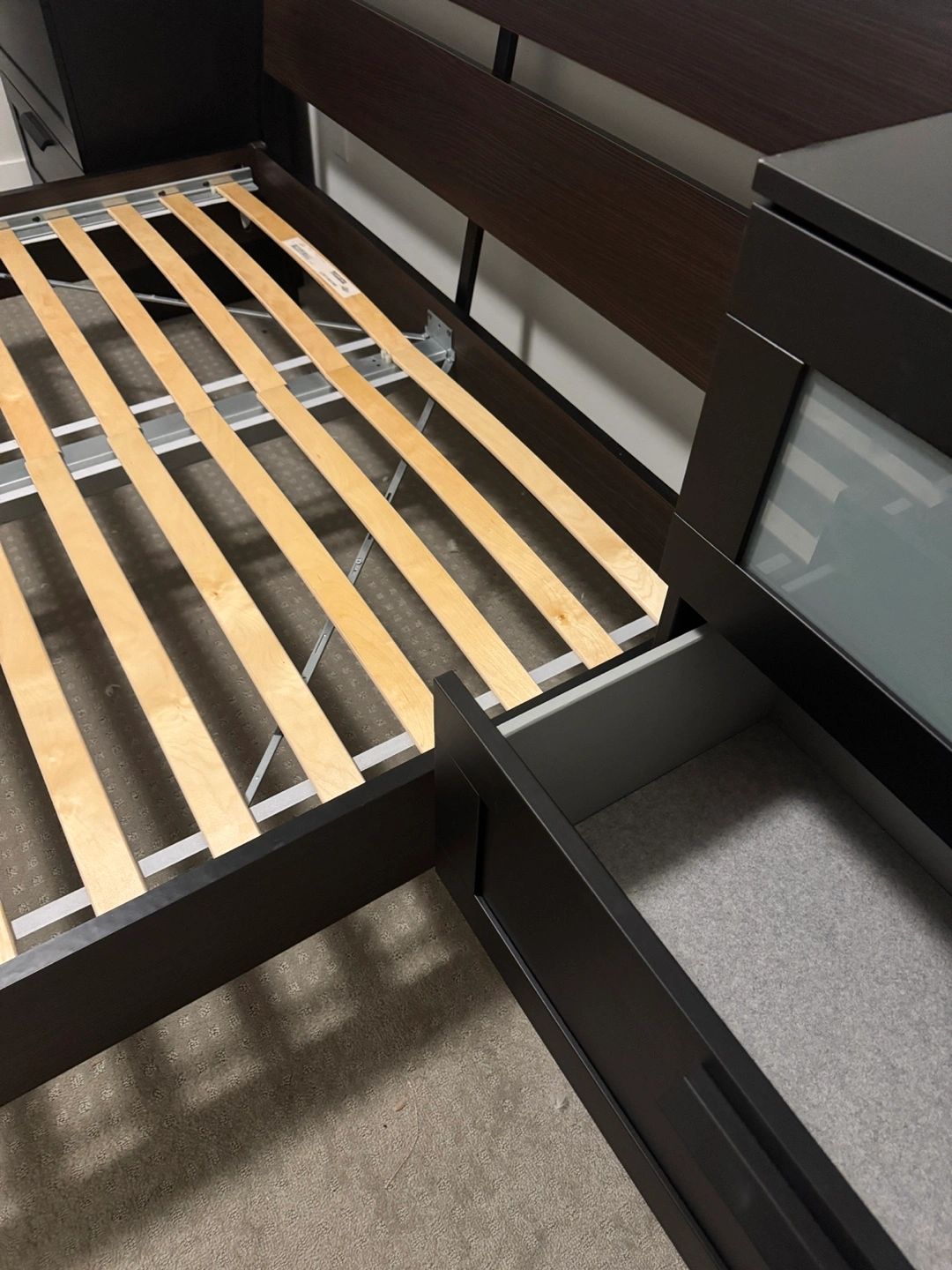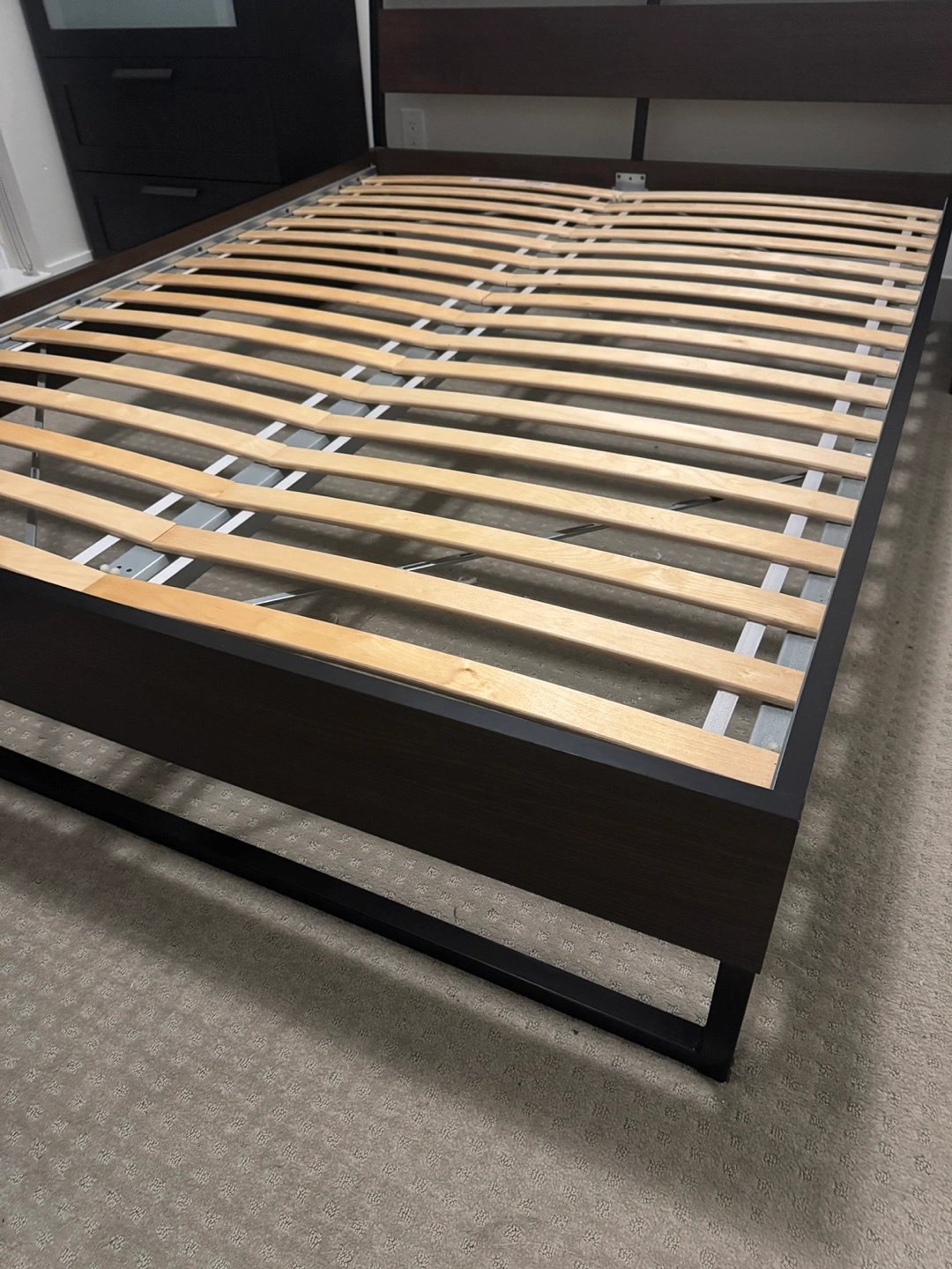 IKEA Trysil - sturdy, metal frame and easy disassembly. One small ding on the headboard but could be easily filled in with a marker and not noticeable