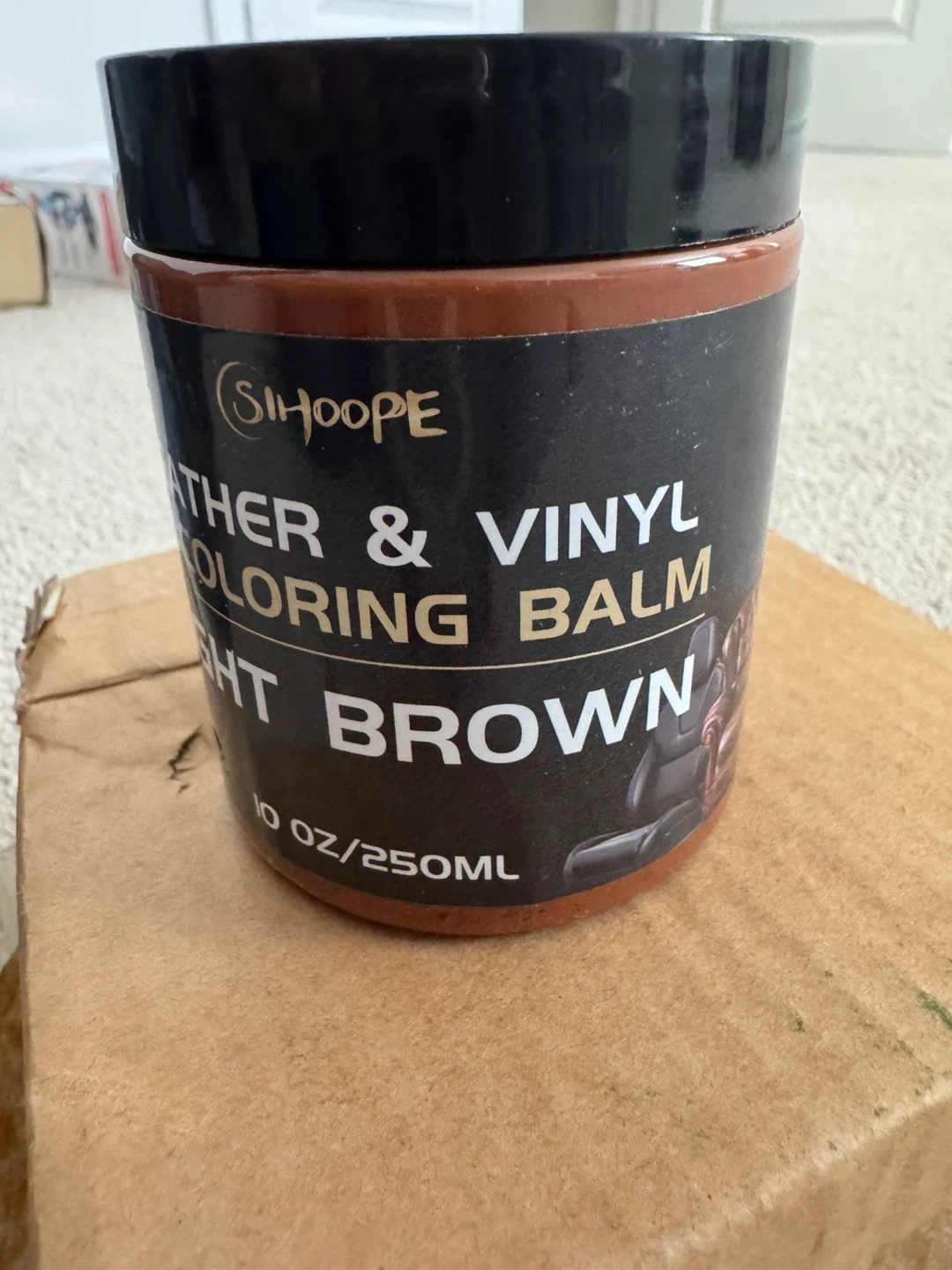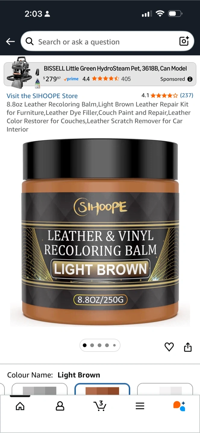 SIHOOPE Leather & Vinyl Recoloring Balm in Light Brown. This 8.8oz container helps fix scratches, fades, and scuffs on leather and vinyl. It's great for refreshing furniture, couches, and car interiors.