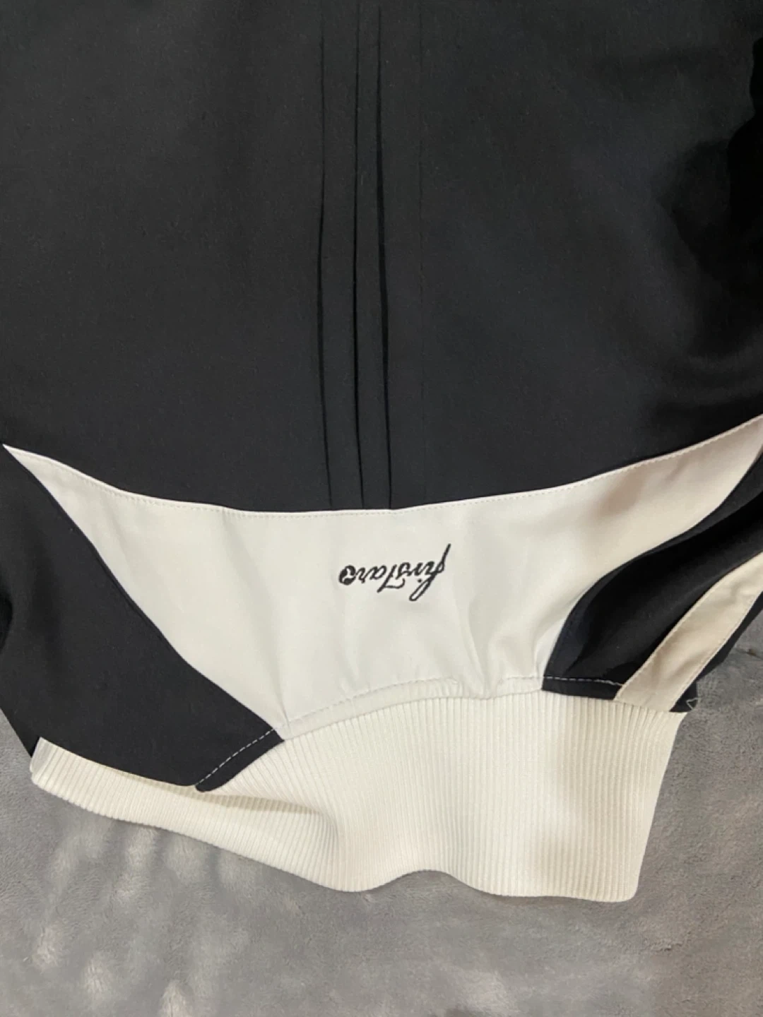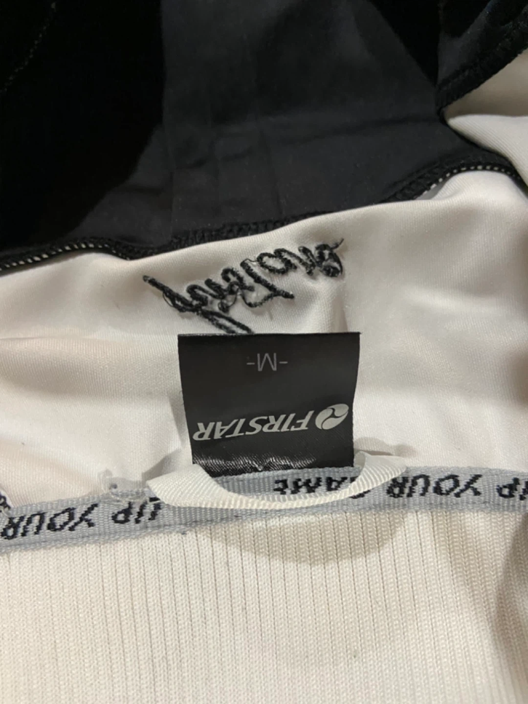 Sask Riders cheerleader jacket and sweater This is a First Star track jacket in black and white. It's a size medium. The jacket has a full zip front and two front pockets.15 for both