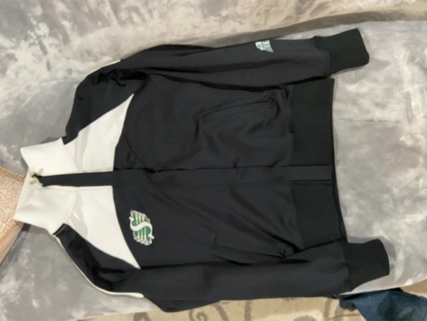 Sask Riders cheerleader jacket and sweater This is a First Star track jacket in black and white. It's a size medium. The jacket has a full zip front and two front pockets.15 for both