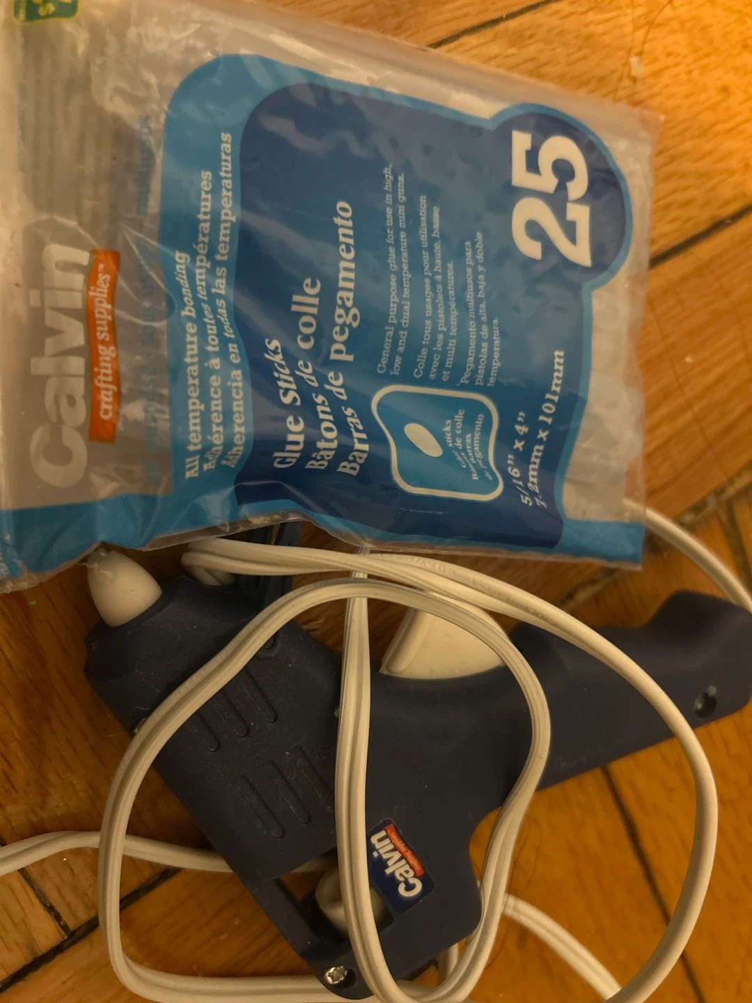 It's a Calvin glue gun with a pack of 25 general purpose glue sticks. The glue sticks are 5/16" x 4" (7.2mm x 101mm) and suitable for high, low, and dual temperature mini guns. It offers all-temperature bonding.
