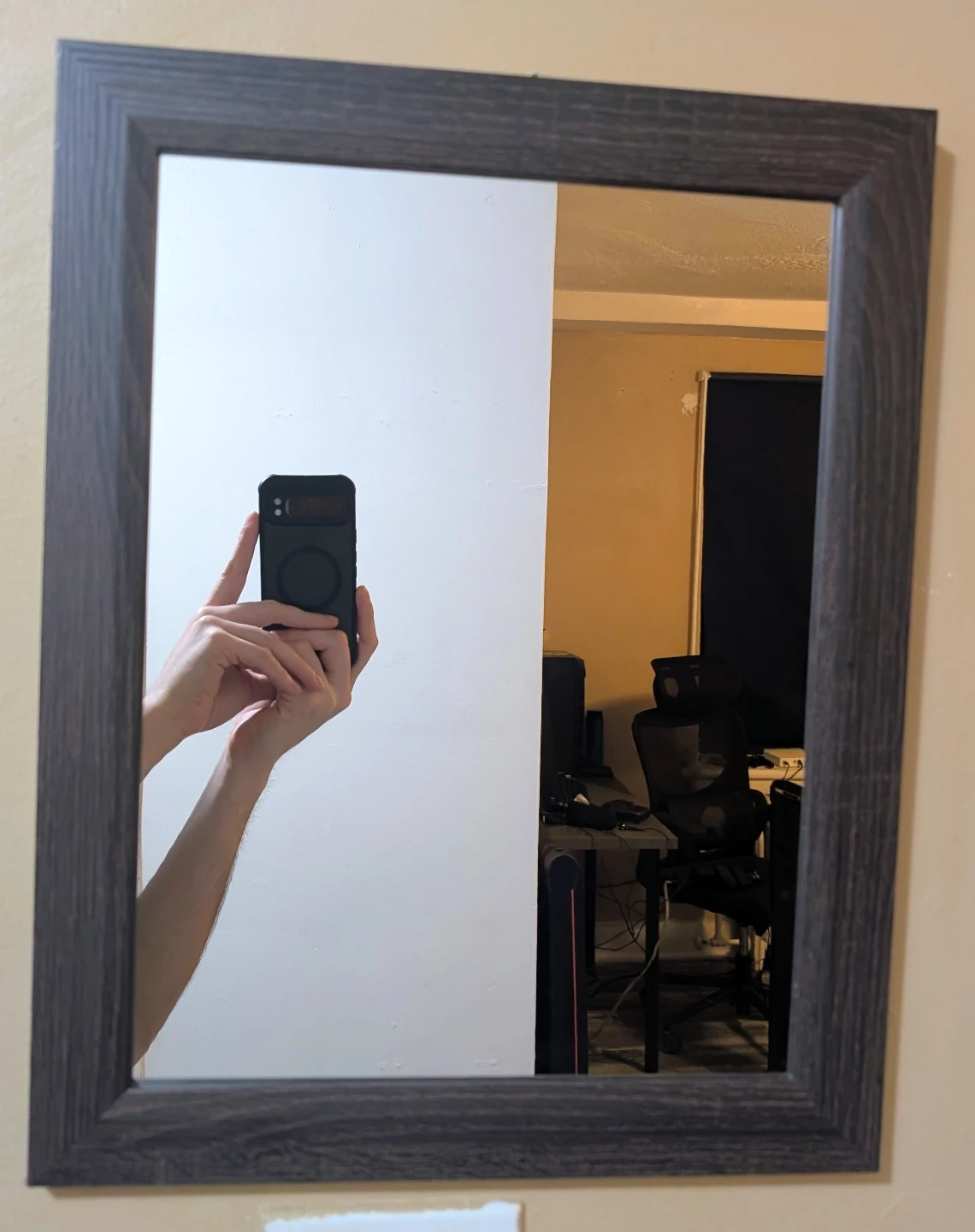 Dark wood-look frame for a wall mirror. It's a rectangular shape. 30x40cm.This mirror's simple design works in most rooms. It's in good condition. Selling due to moving.