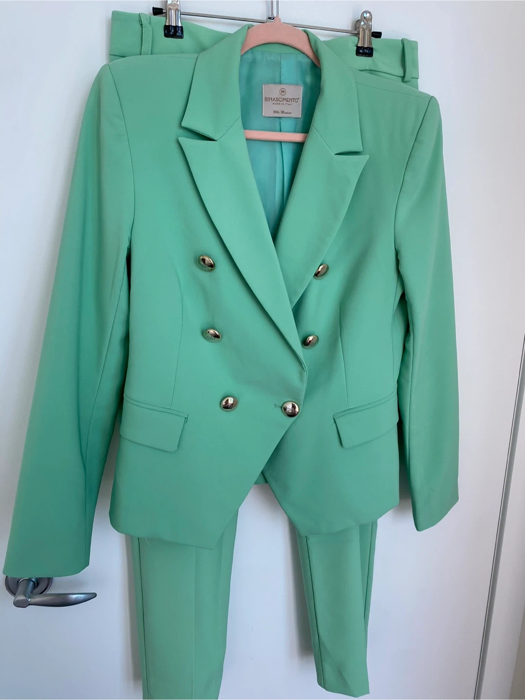 Beautiful mint green double-breasted blazer with matching tailored pants from Rinascimento. The blazer has gold-toned buttons and a smooth satin lining. This suit is perfect for making a stylish statement at any event. Made in Italy.