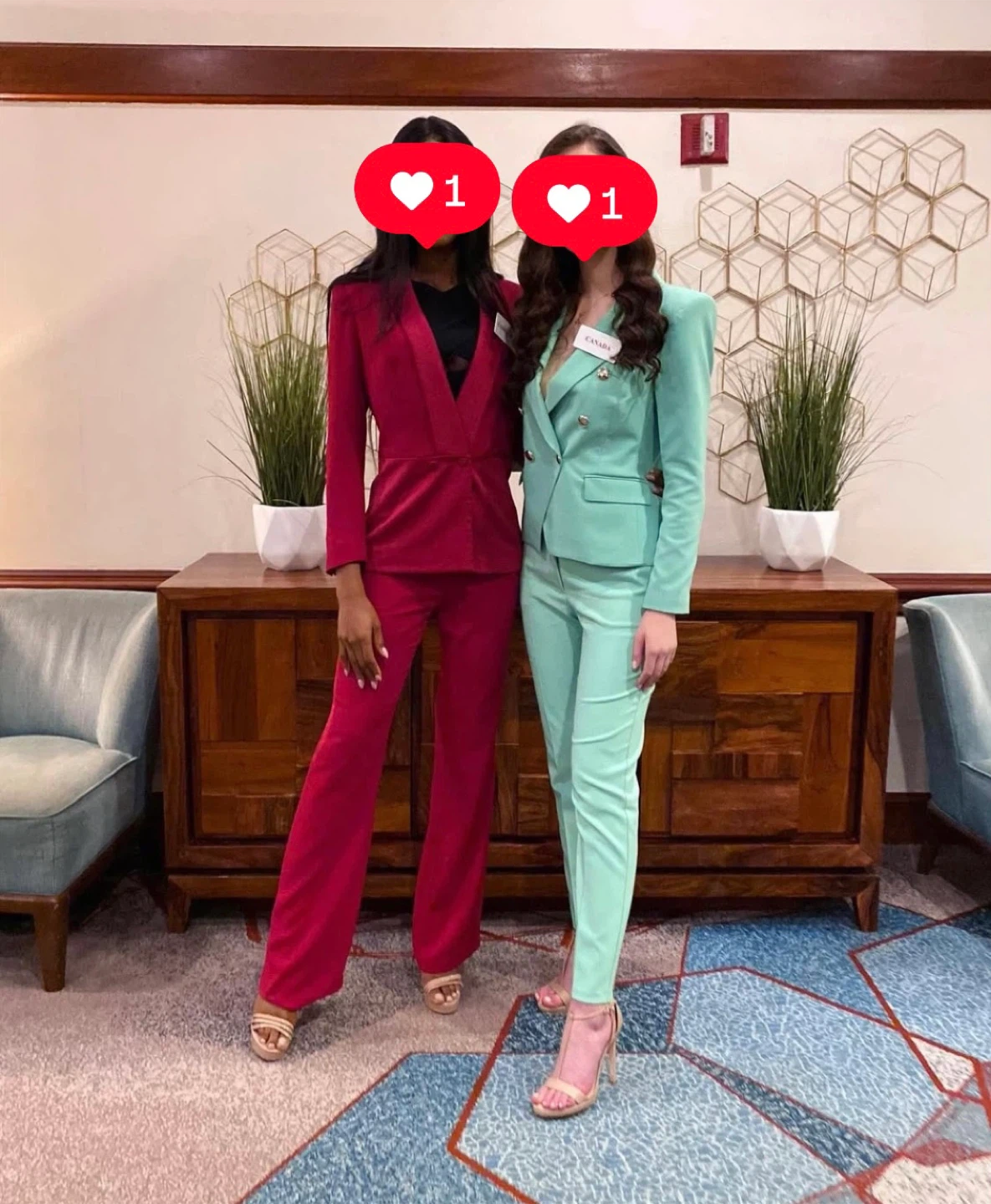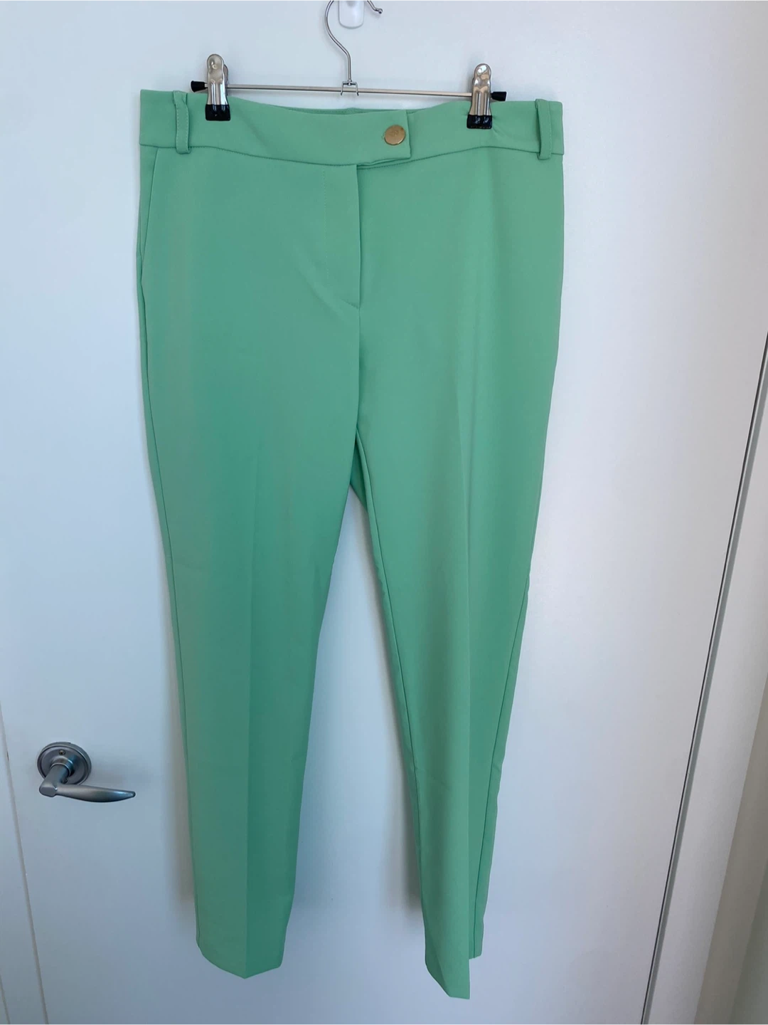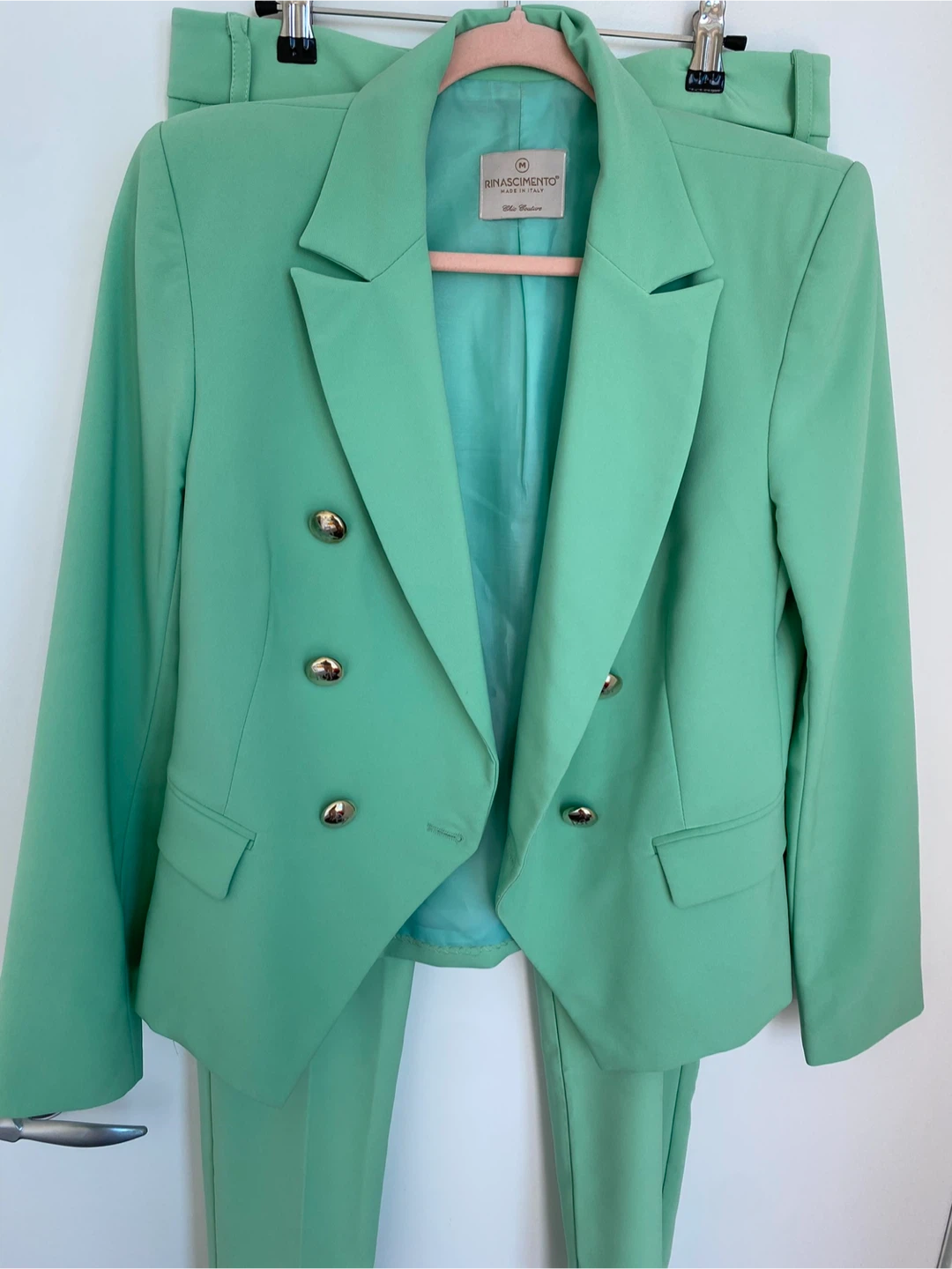 Beautiful mint green double-breasted blazer with matching tailored pants from Rinascimento. The blazer has gold-toned buttons and a smooth satin lining. This suit is perfect for making a stylish statement at any event. Made in Italy.