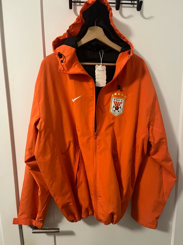 I'm offering a brand new Nike jacket, perfect for sports or casual wear. This stylish orange jacket features the TSFC logo and is in pristine condition with original tags.