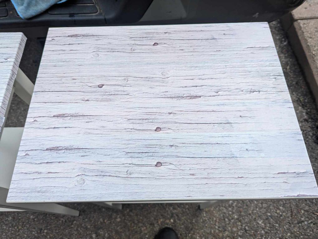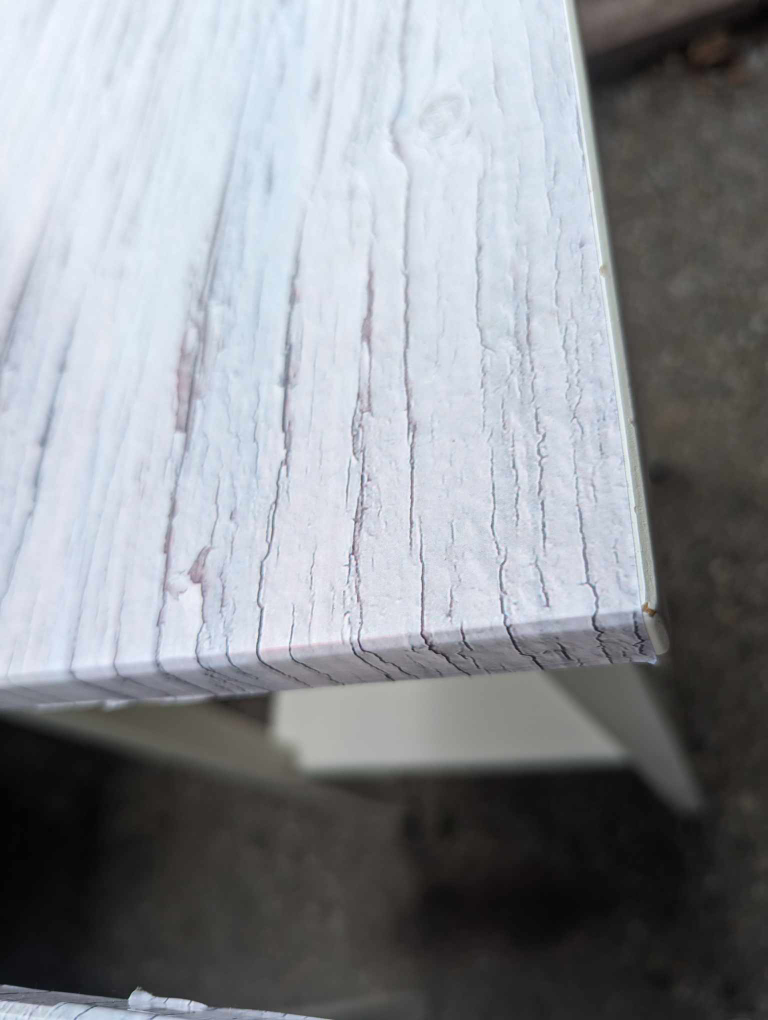 The top is covered with wood print wallpaper, because of some minor bubbling underneath.
