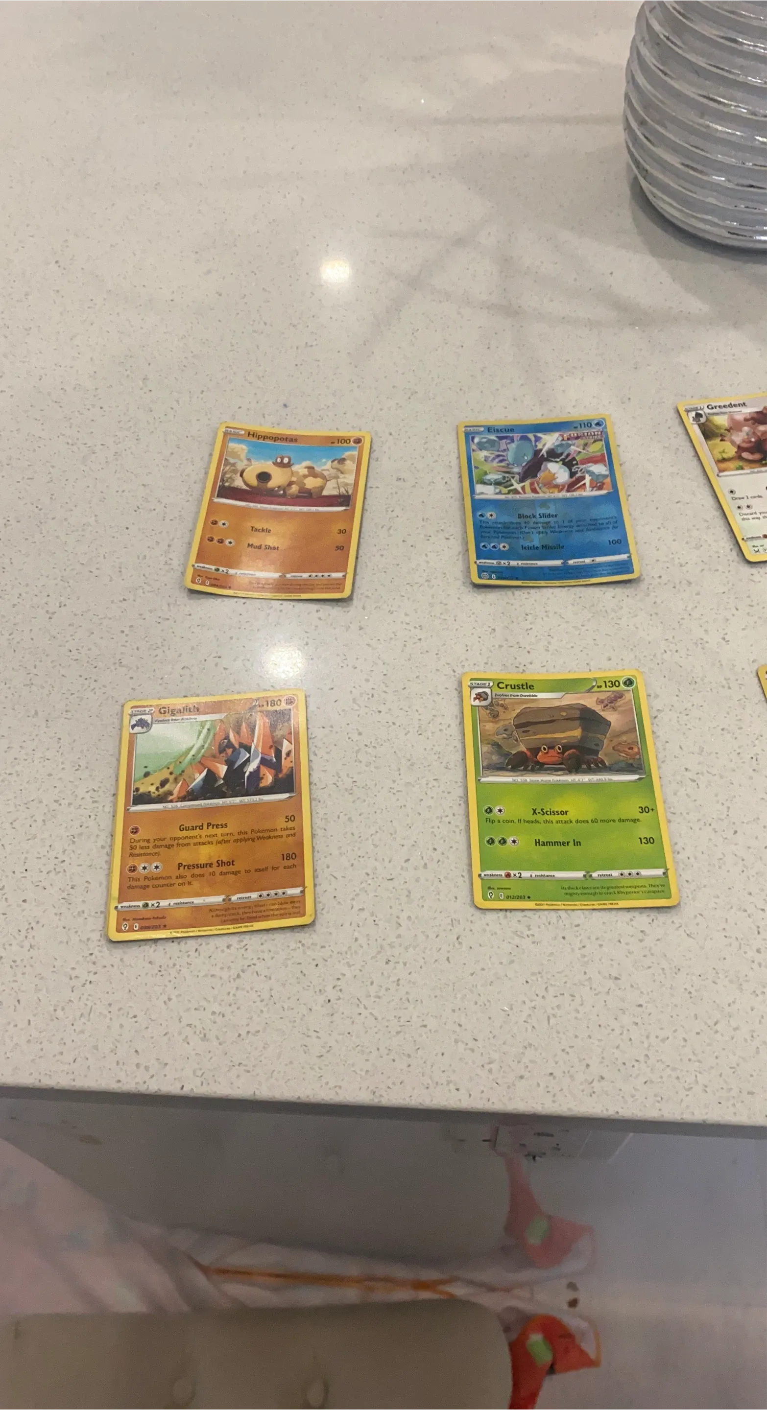 Assorted Pokemon trading cards including Gigalith, Crustle, Hippowdon, Greadent, and more. These cards are great for collectors and players alike. Add these to your collection today!