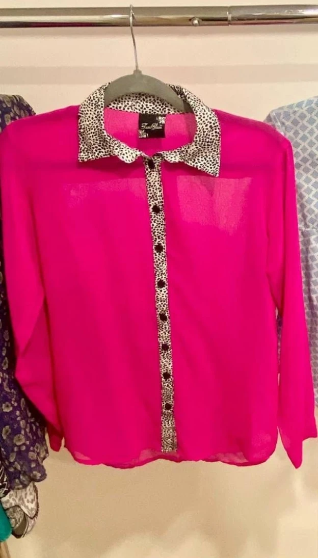 Vintage bright pink long-sleeved blouse. It features a striking cheetah print on the collar and down the button placket. Sheer material.