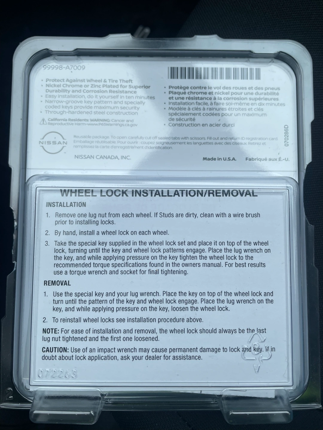 New, unused set of four Nissan genuine wheel locks. Includes key and installation instructions. Chrome plated for durability and corrosion resistance. Part number 9999-A7009. Perfect for added security.