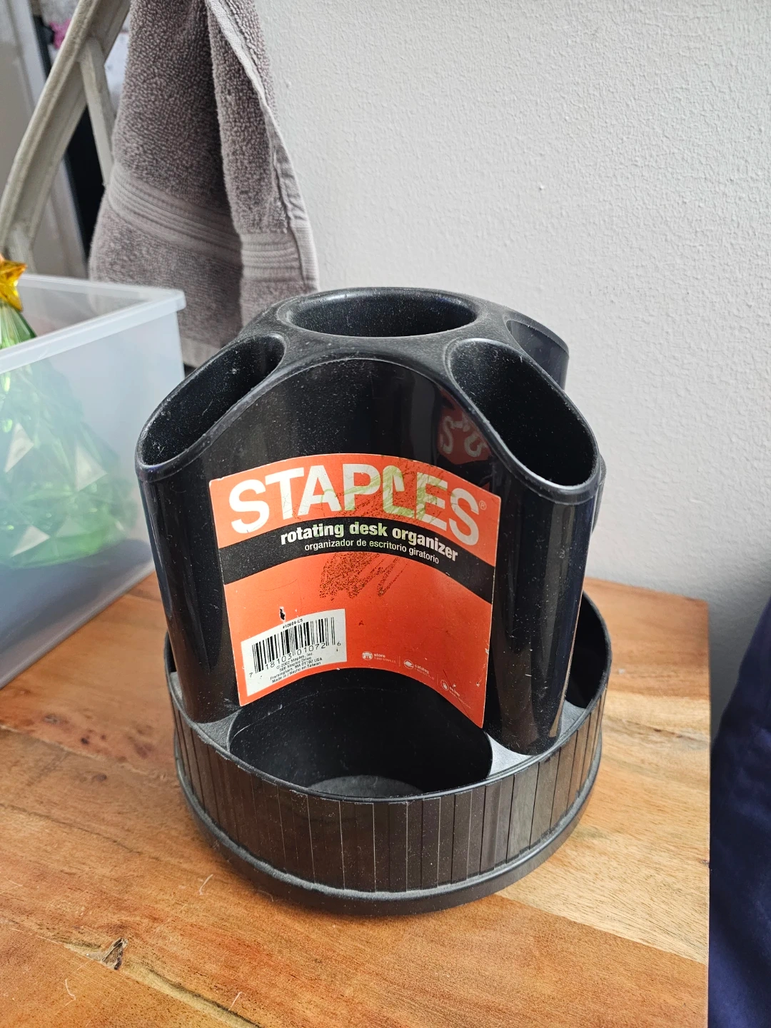 This is a black rotating desk organizer from Staples. It's made of plastic and has multiple compartments. It's great for keeping pens, pencils, and other office supplies neat and accessible!