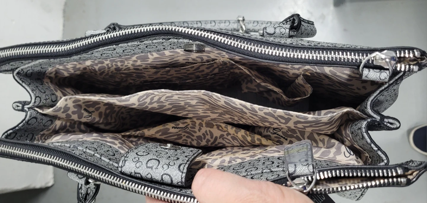 Selling a Guess tote bag in black/noir colour. It features a stylish all-over logo print and a spacious interior with a fun leopard print lining.