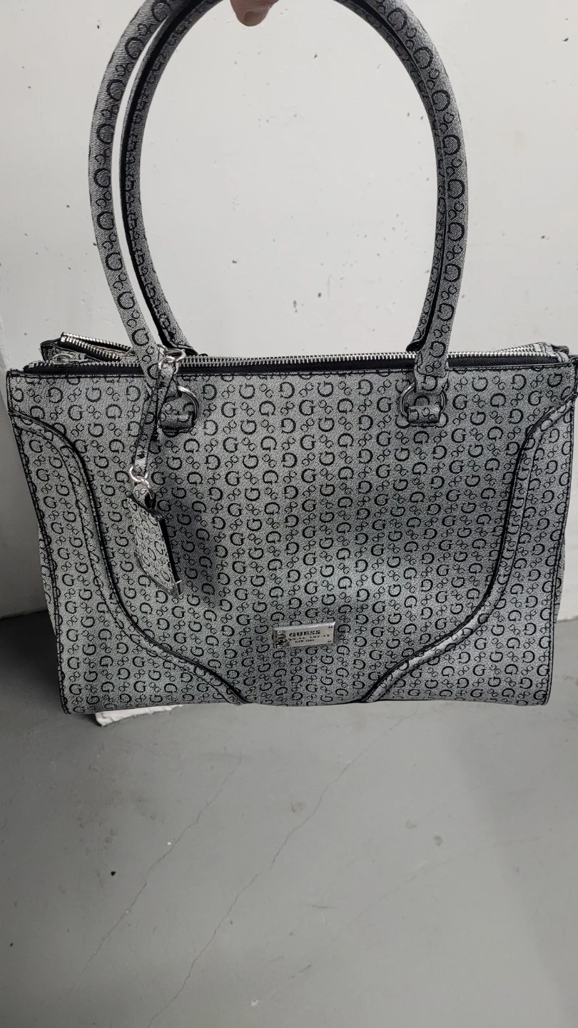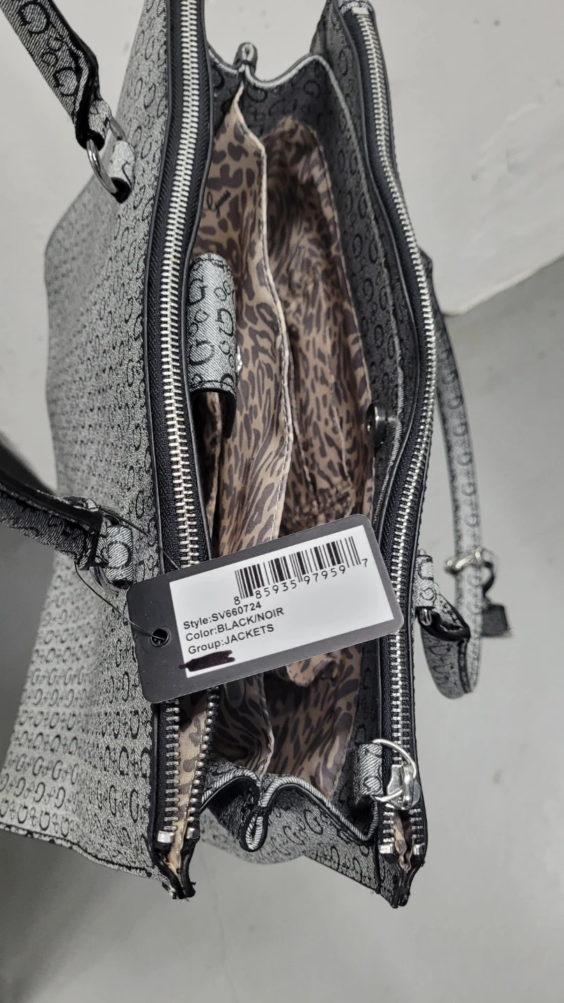 Selling a Guess tote bag in black/noir colour. It features a stylish all-over logo print and a spacious interior with a fun leopard print lining.