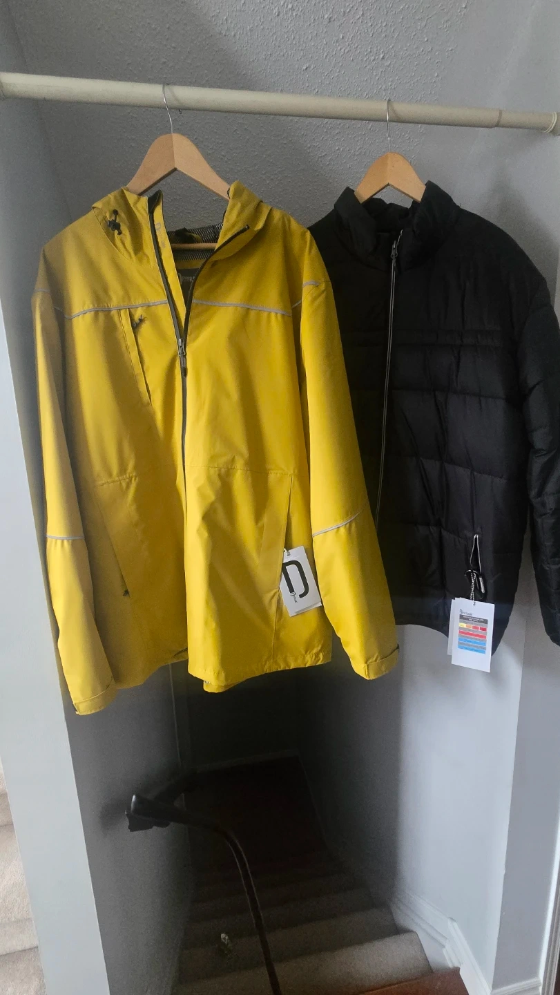Yellow hooded waterproof shell with reflective detailing and a black puffer jacket worn as a liner for cold weather comfort. Both are great for layering in unpredictable weather. Zipped front closures on both.
