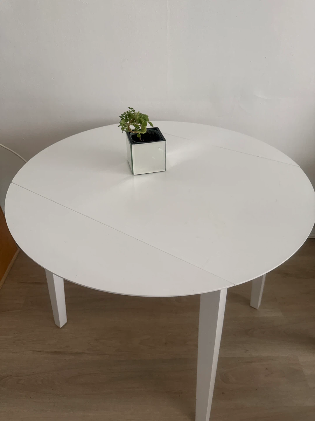 A simple white round dining table. It's a great size for smaller dining areas. Legs are sturdy and white.
