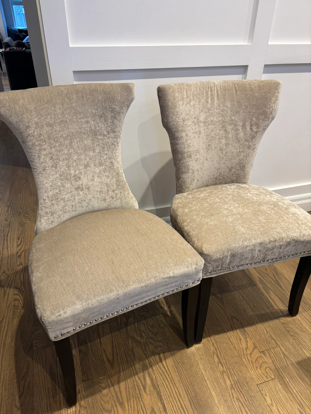 Beautiful set of six beige velvet dining chairs. They feature a sophisticated wingback design with elegant nailhead trim. The upholstery is a soft, plush velvet material. These chairs are sure to add a touch of class to any dining room!
