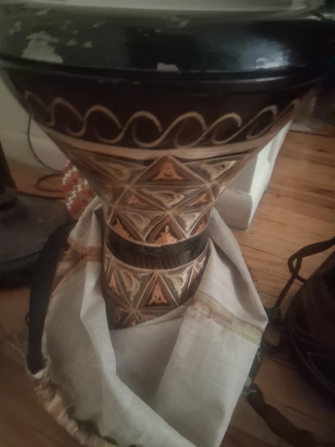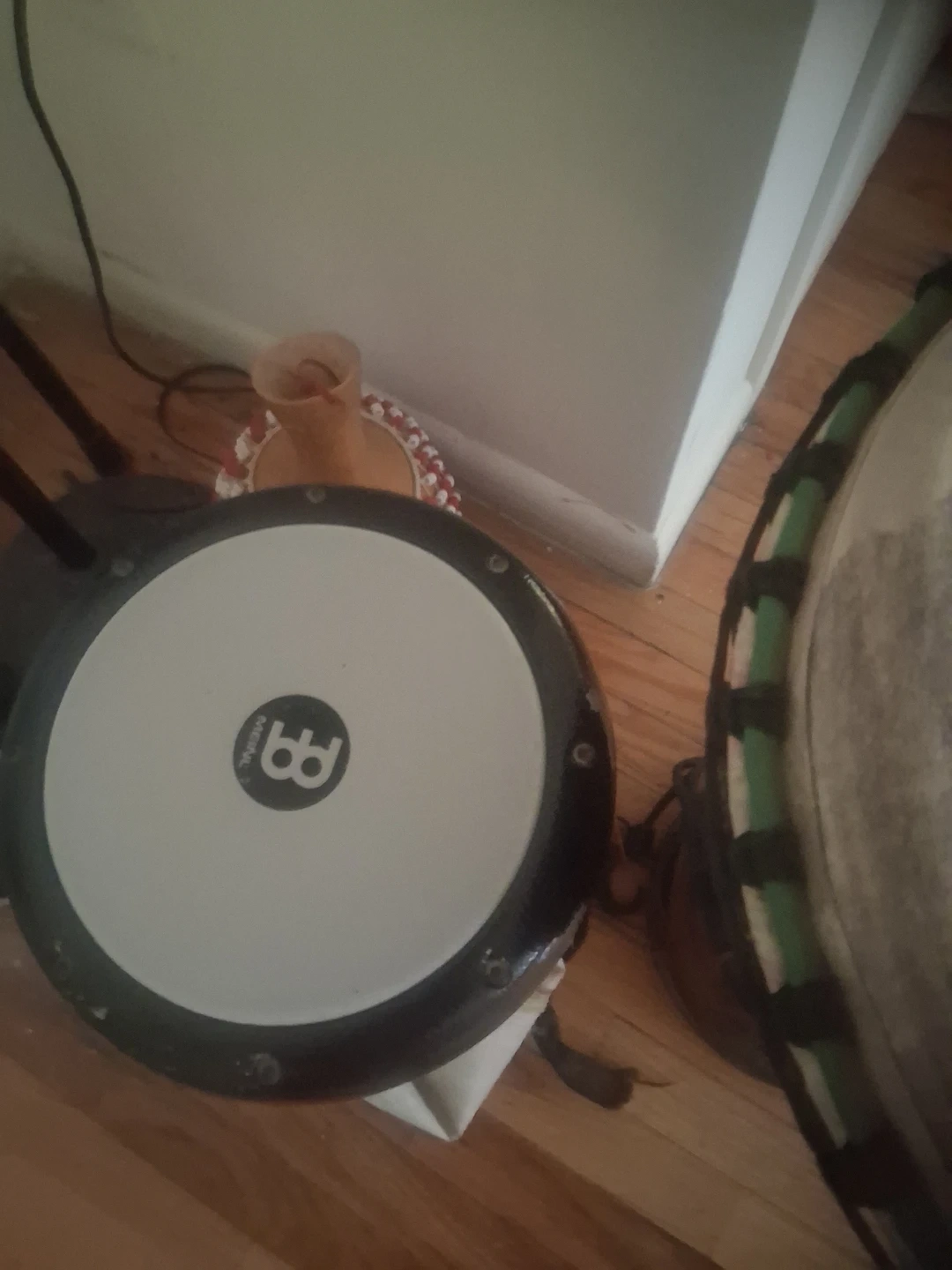This is a djembe drum with a goatskin head.14 inches wide the skin head. It features a decorative, hand-painted wooden body. The drum is approximately 20 inches tall. This instrument is perfect for beginners or experienced percussionists. Great sound well made.