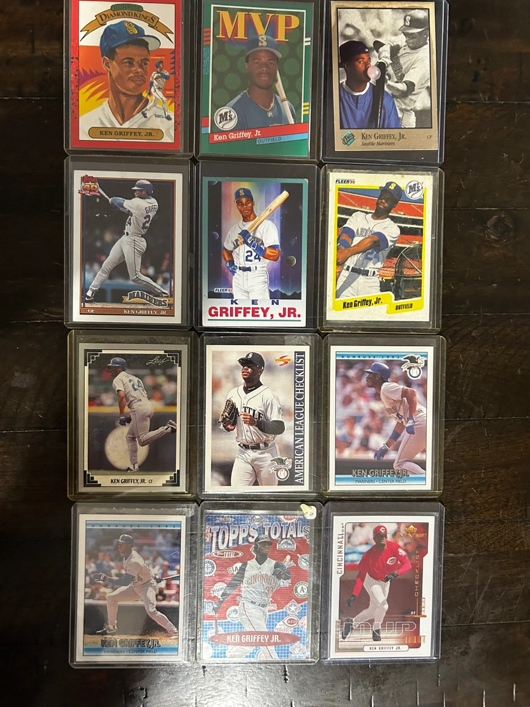 A lot of 11 Ken Griffey Jr. baseball cards. Includes various brands like Diamond Kings, MVP, Fleer, Topps, and Donruss. Cards feature different years and sets from his career.