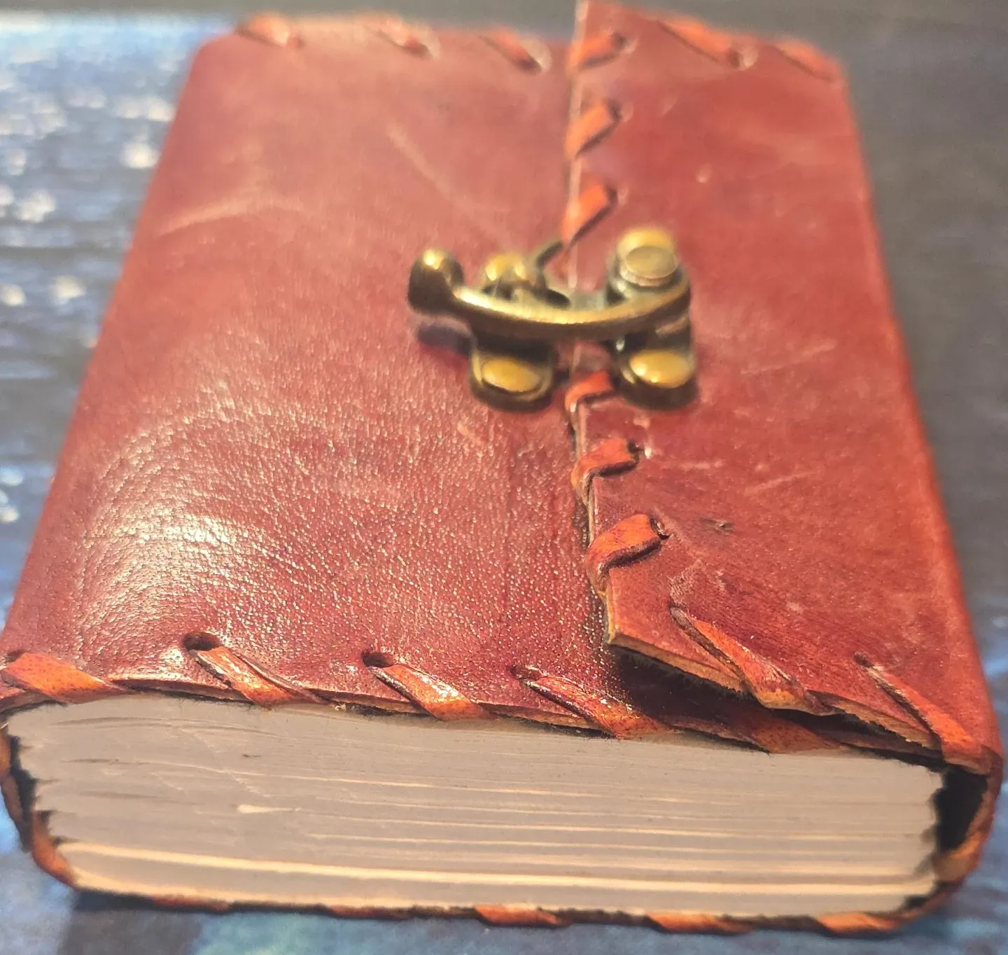 This is a red leather journal with a decorative metal clasp. It's bound with stitching around the edges. The pages are blank and ready for your notes or sketches. A nice item for anyone who likes to write or draw!