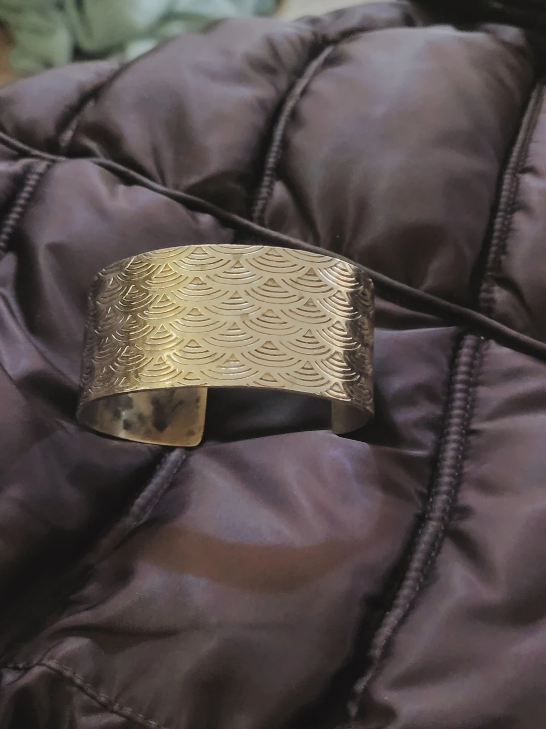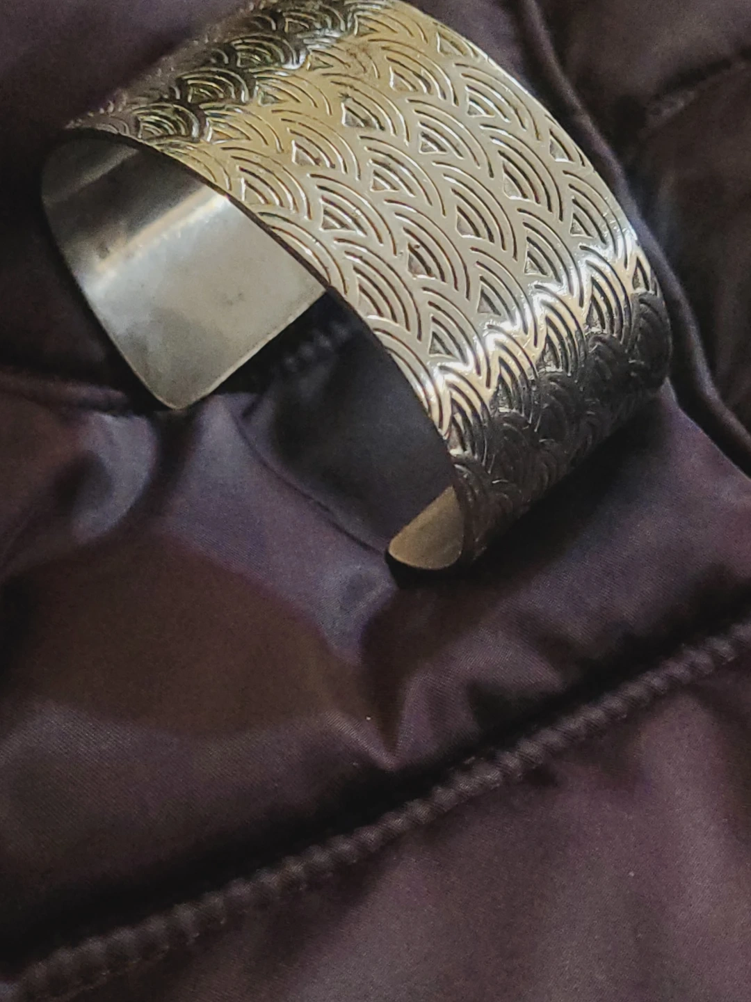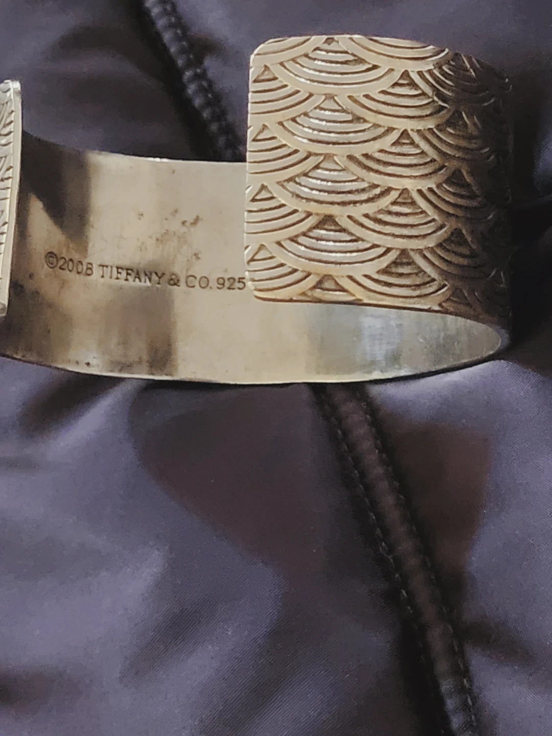 This is a Tiffany & Co. 2008 silver cuff bracelet. It features a repeating wave pattern. It's made of .925 sterling silver. Perfect for adding a touch of elegance to any outfit!