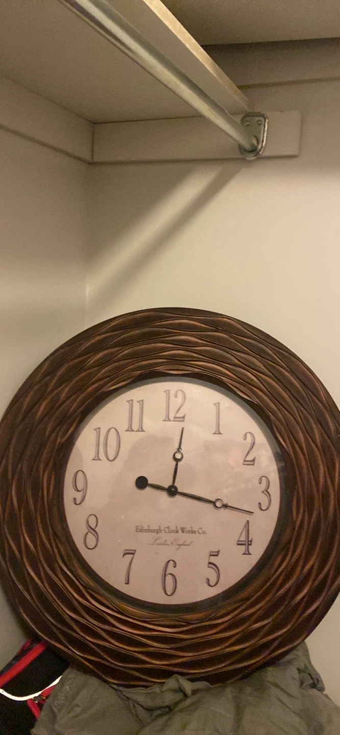 This is a wall clock from Edinburgh Clock Works Co. It features a decorative brown frame and clear numerals. It's a nice addition to any room!