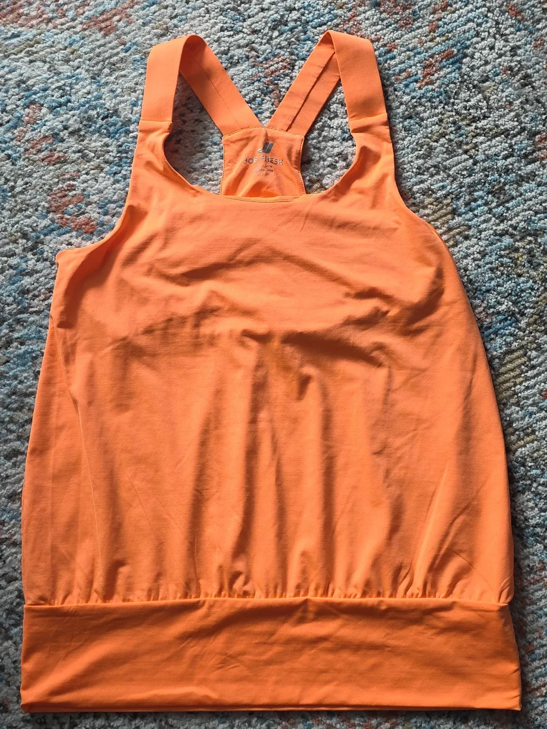 This is an orange tank top from Joe Fresh. It's a racerback style with a gathered hem. This tank is size medium and made of soft fabric. Has built in shelf bra.