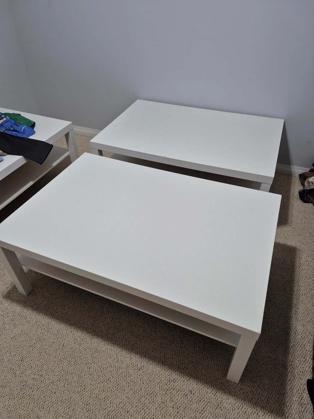 3 White coffee table with a convenient lower shelf for storage. It's made from particleboard and has a smooth, matte finish. This table works well in a living room for holding drinks or displaying decor. It's great for small spaces! $40 each