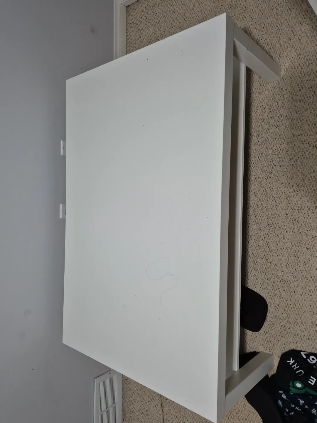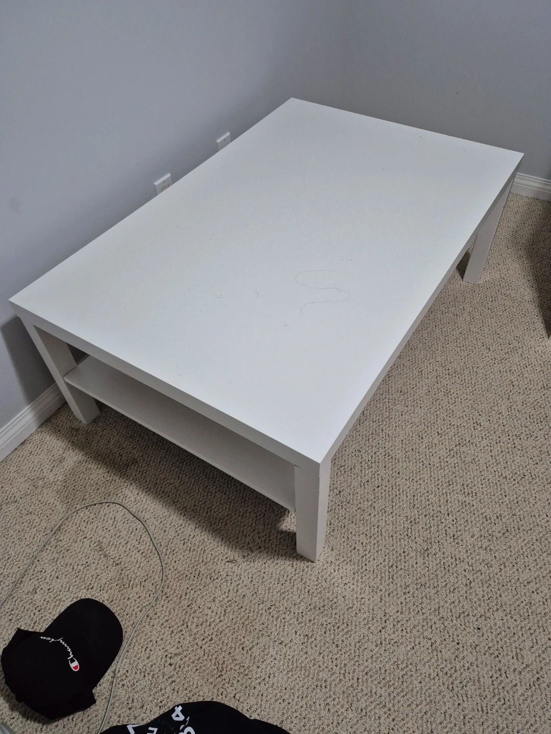 3 White coffee table with a convenient lower shelf for storage. It's made from particleboard and has a smooth, matte finish. This table works well in a living room for holding drinks or displaying decor. It's great for small spaces! $40 each