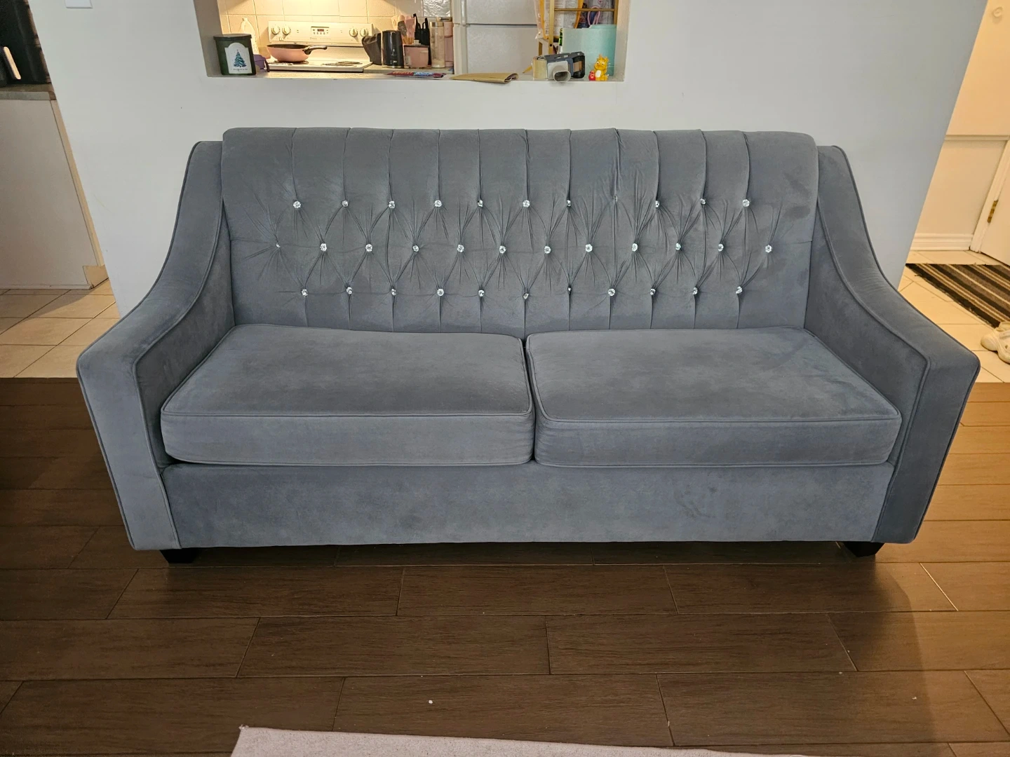 This is a grey upholstered sofa with diamond tufting on the backrest and crystal button accents. It features comfortable seat cushions and a stylish silhouette. Sits two or three comfortably.