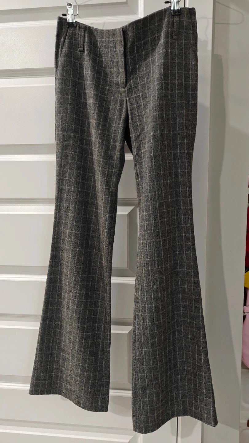 These Maje flared trousers are a size 34 and equivalent to a US XS. They're made with a wool blend fabric featuring a plaid pattern. The main fabric is 41% Polyester, 35% Acrylic, 18% Recycled sheep wool, 5% Viscose, and 1% Elastane. The lining is 100% Cotton.