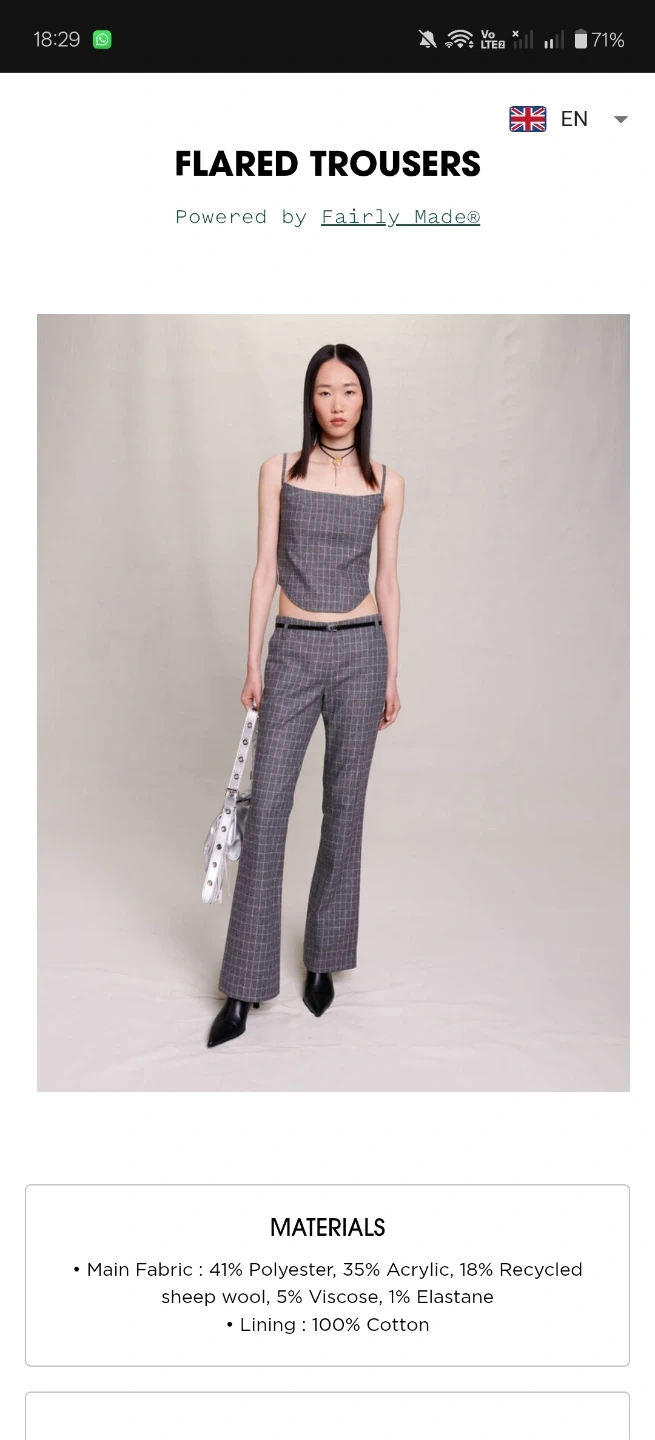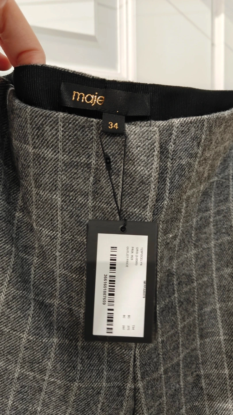 These Maje flared trousers are a size 34 and equivalent to a US XS. They're made with a wool blend fabric featuring a plaid pattern. The main fabric is 41% Polyester, 35% Acrylic, 18% Recycled sheep wool, 5% Viscose, and 1% Elastane. The lining is 100% Cotton.