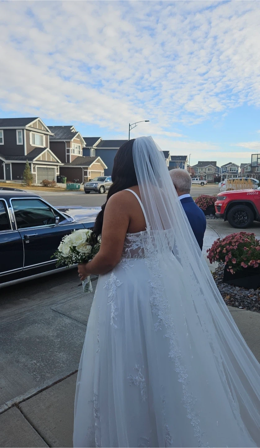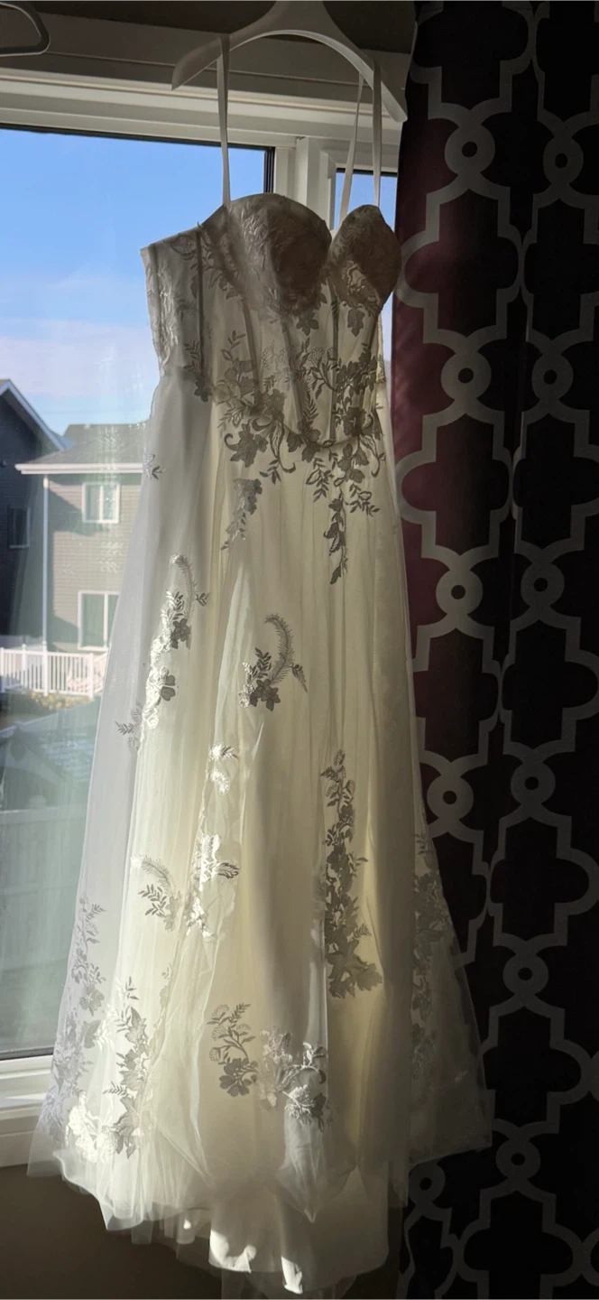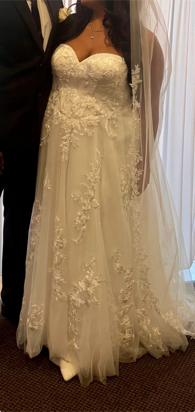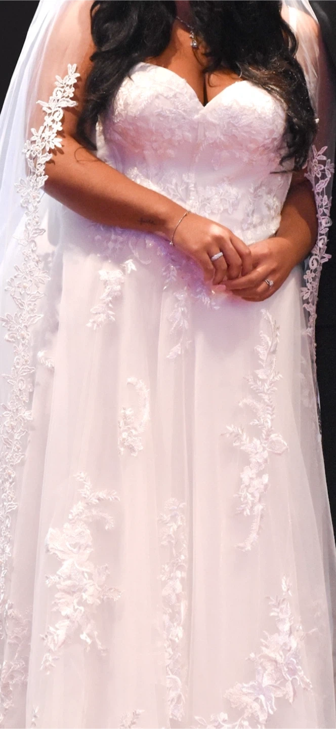 Beautiful white strapless wedding dress. It features intricate lace appliques and a flowing tulle skirt. This dress would be perfect for a wedding day!