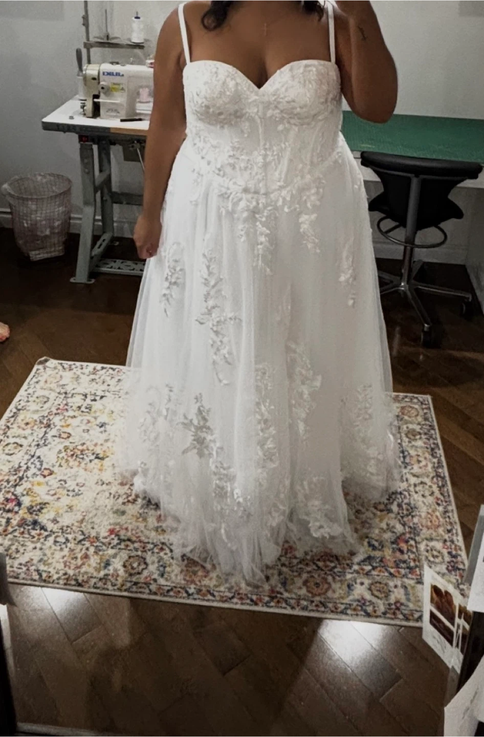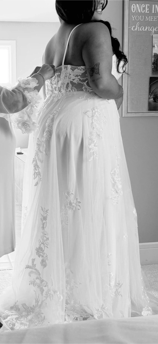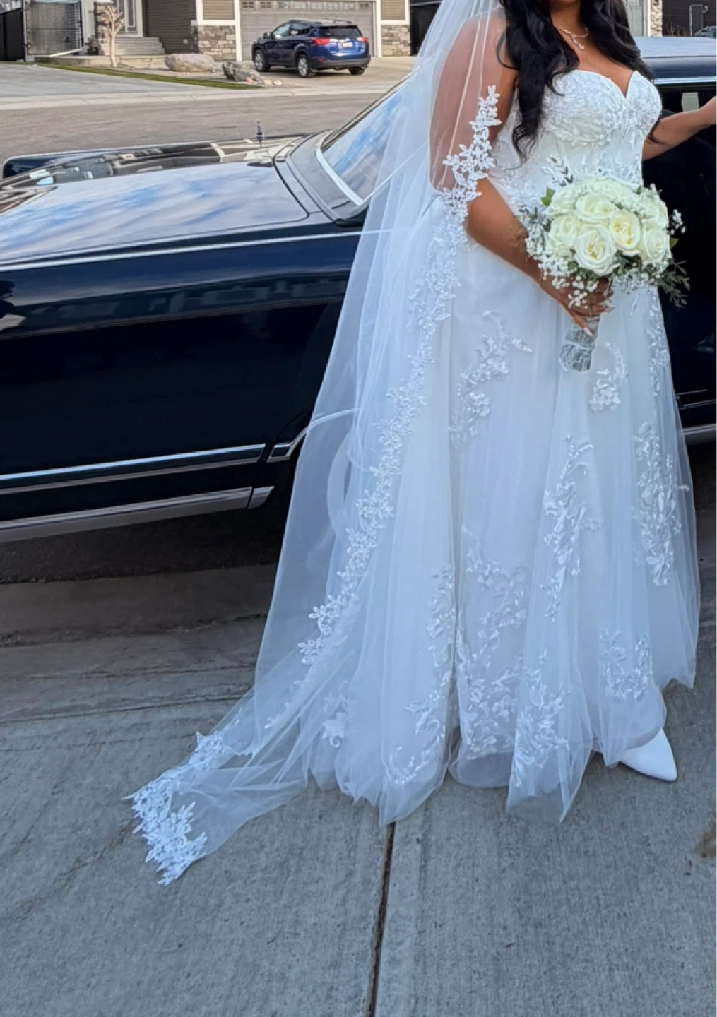 Beautiful white strapless wedding dress. It features intricate lace appliques and a flowing tulle skirt. This dress would be perfect for a wedding day!