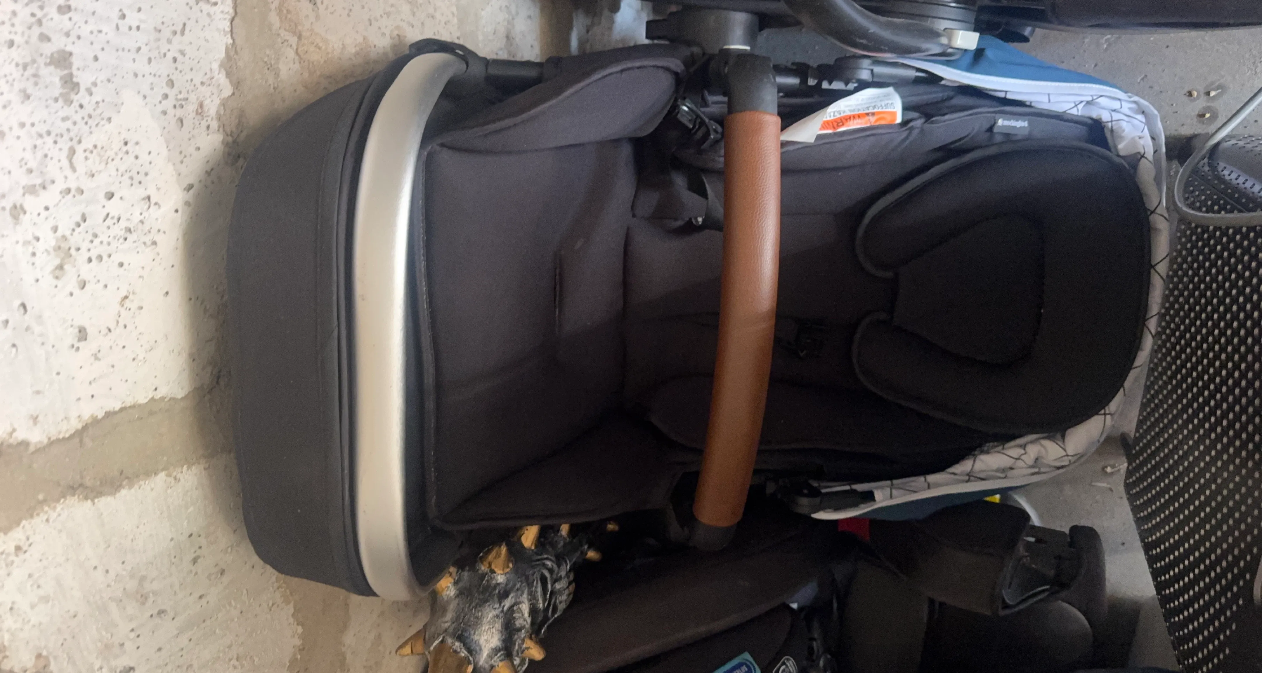 This is a black Uppababy Vista stroller seat. It features a brown leatherette handlebar. The seat has a padded insert for added comfort. It's suitable for toddlers up to 50 lbs.