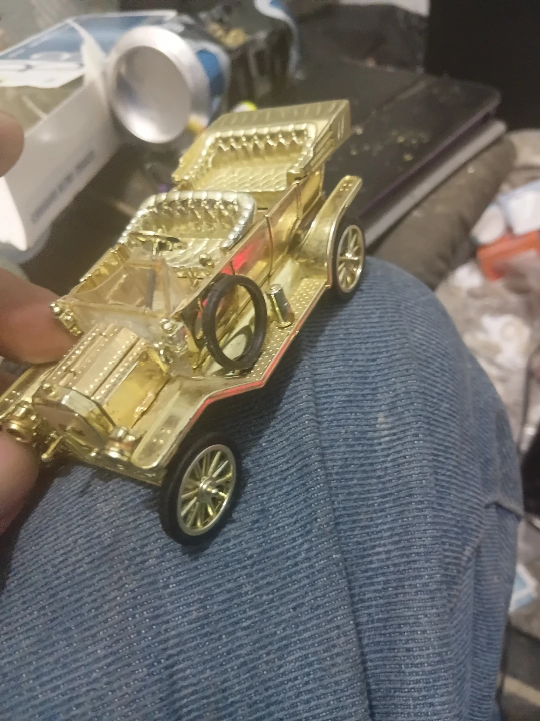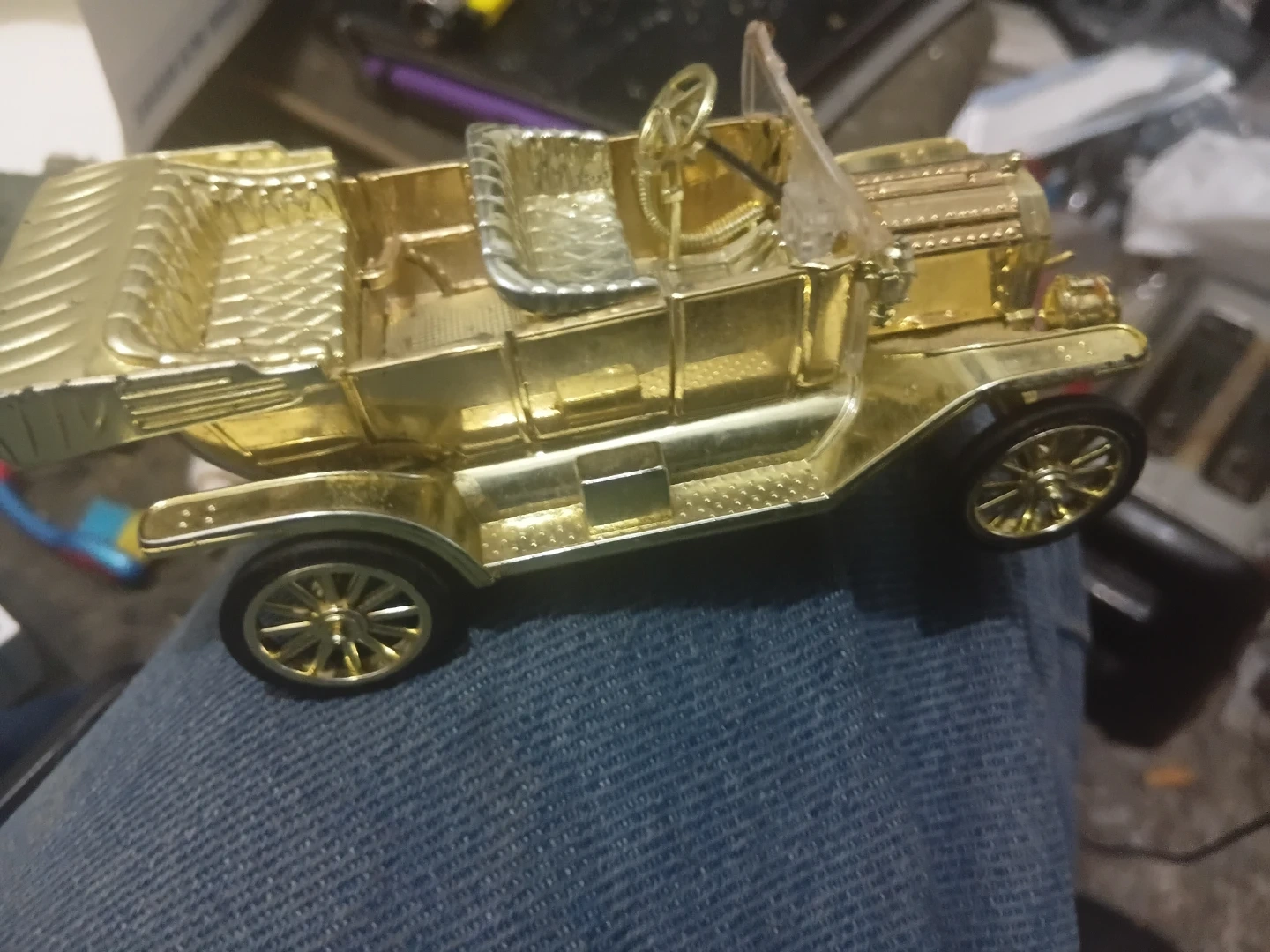 This is a gold-coloured diecast model of an antique car. It features intricate detailing and a classic design. Great for collectors or as a display piece!