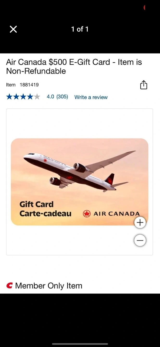 An Air Canada $150 E-Gift Card is available. Use it for flights or other Air Canada services. Balance is 150.00 CAD.