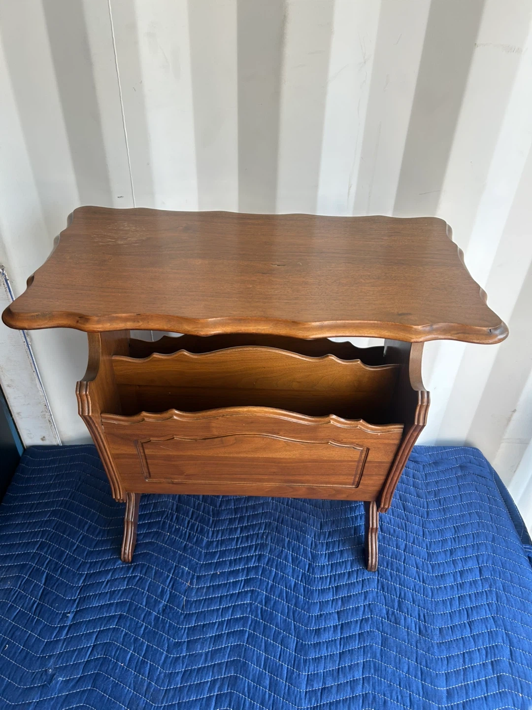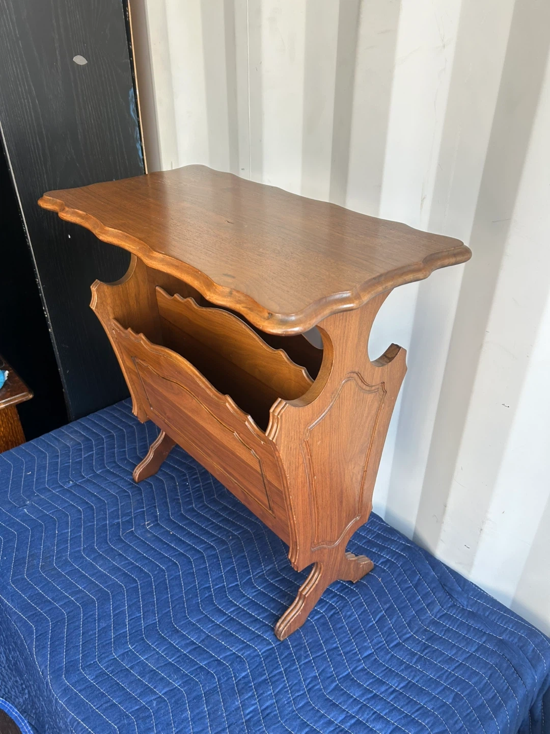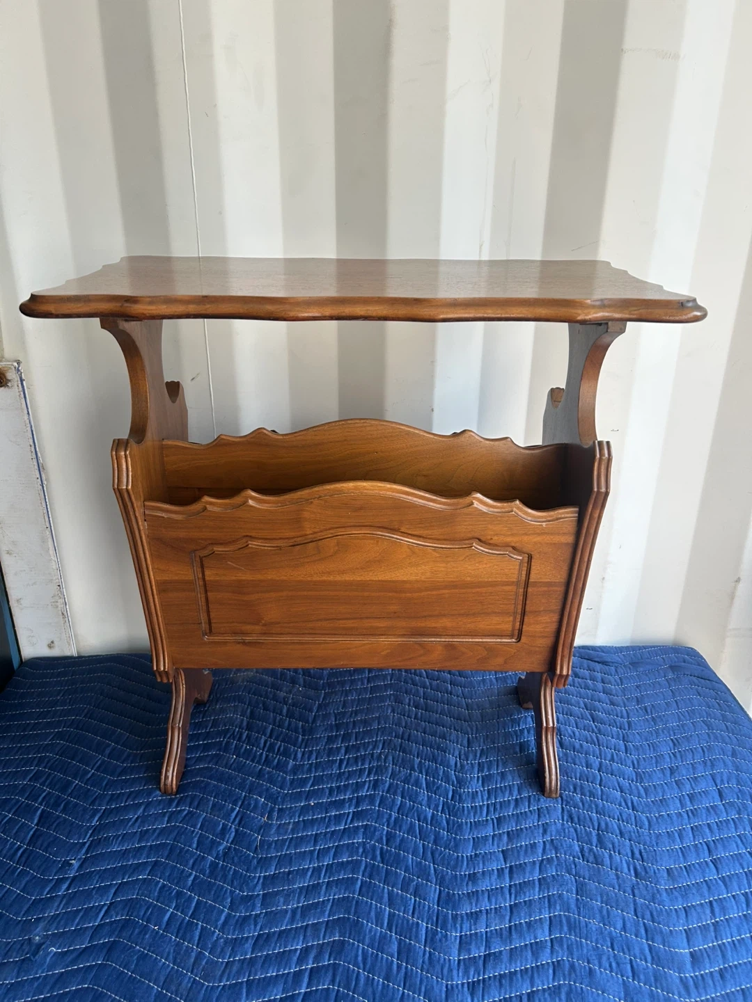 This is a lovely vintage magazine rack end table, perfect for adding a touch of classic charm to your living room or reading nook. It's made of wood and features a convenient magazine storage area below the tabletop.