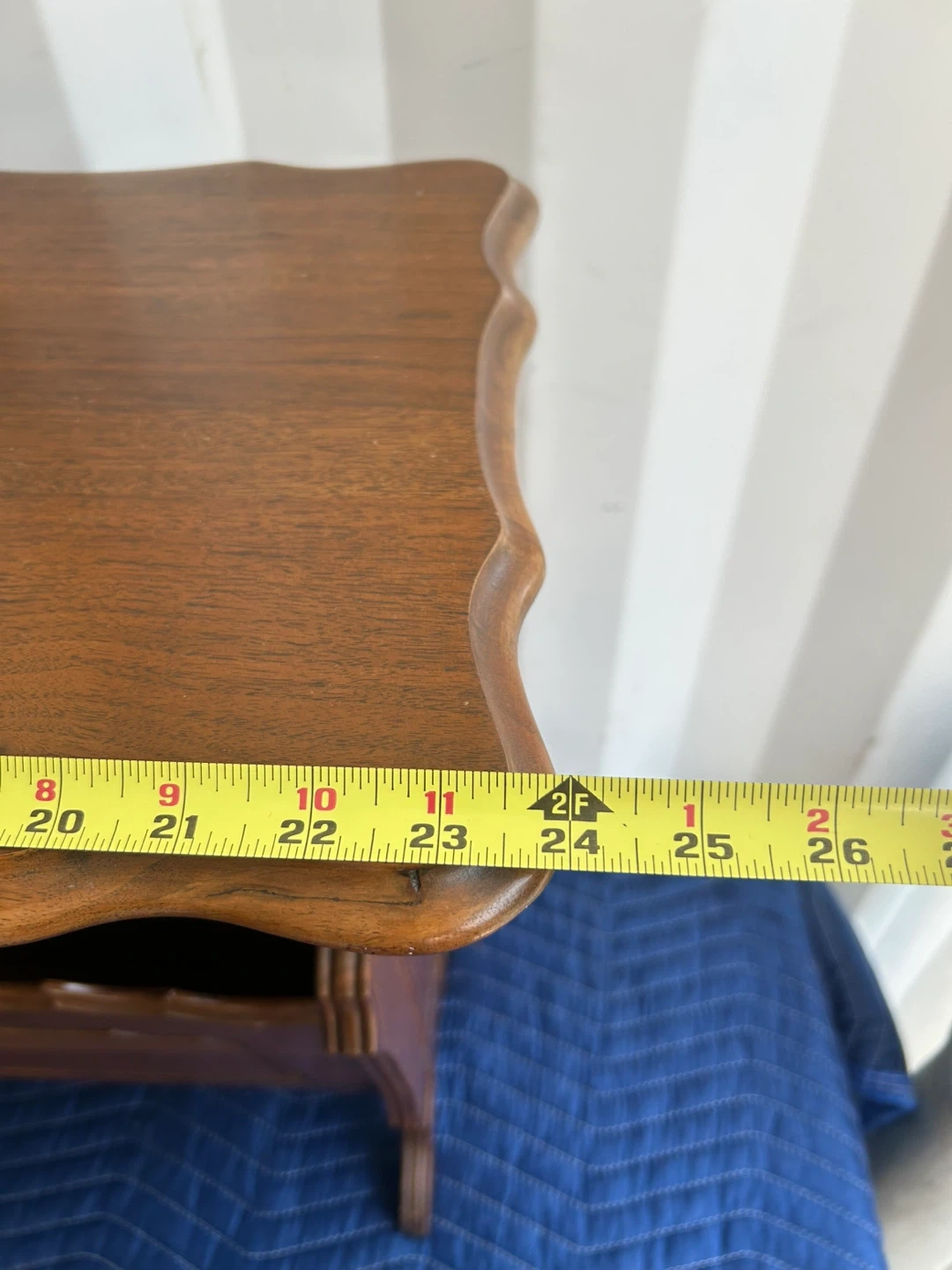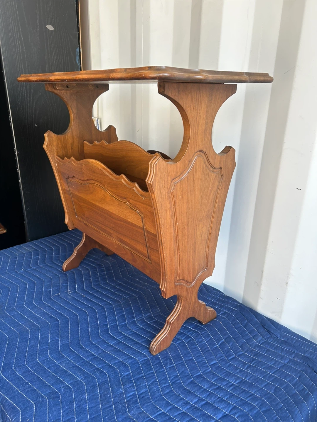 This is a lovely vintage magazine rack end table, perfect for adding a touch of classic charm to your living room or reading nook. It's made of wood and features a convenient magazine storage area below the tabletop.