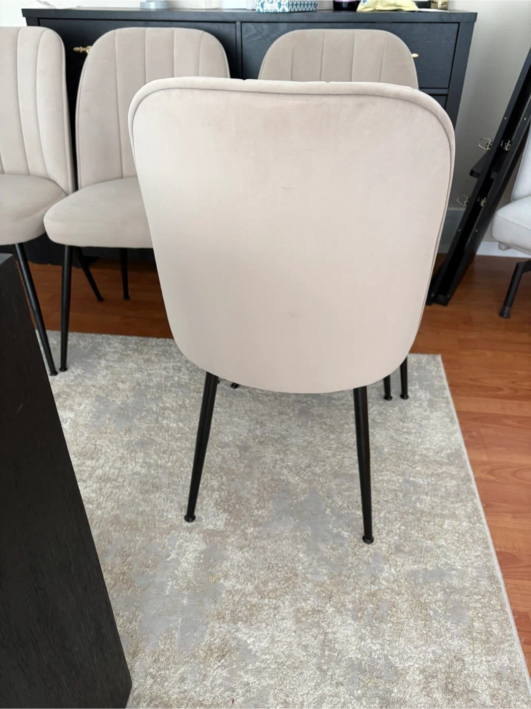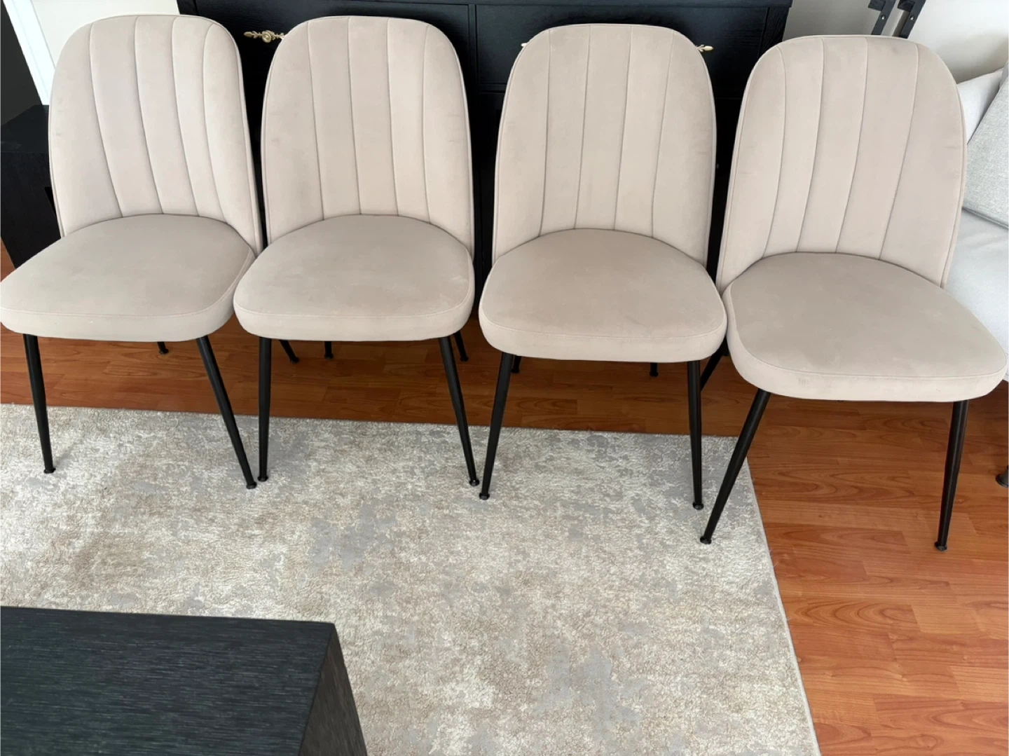 Four beige upholstered dining chairs with black metal legs. These chairs feature a ribbed back design and a comfortable seat. They're a nice addition to any dining room or kitchen area!