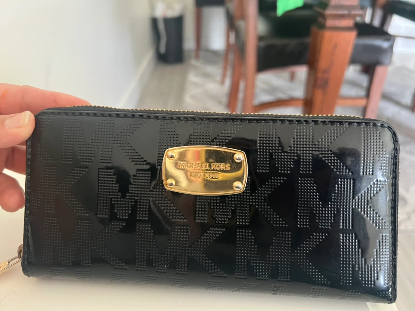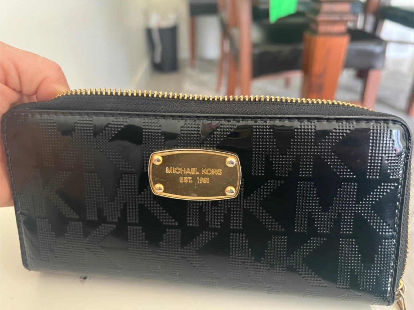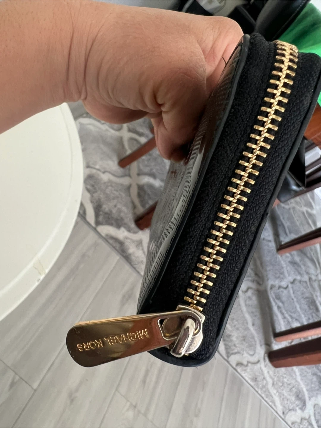 This is a Michael Kors zip-around wallet. It features the signature MK pattern in black with gold-tone hardware. The interior has multiple card slots and compartments for organization. UAE only once over 300 when I buy it in cross iron mall very beautiful a lot of rooms