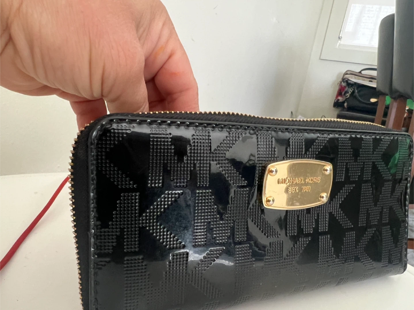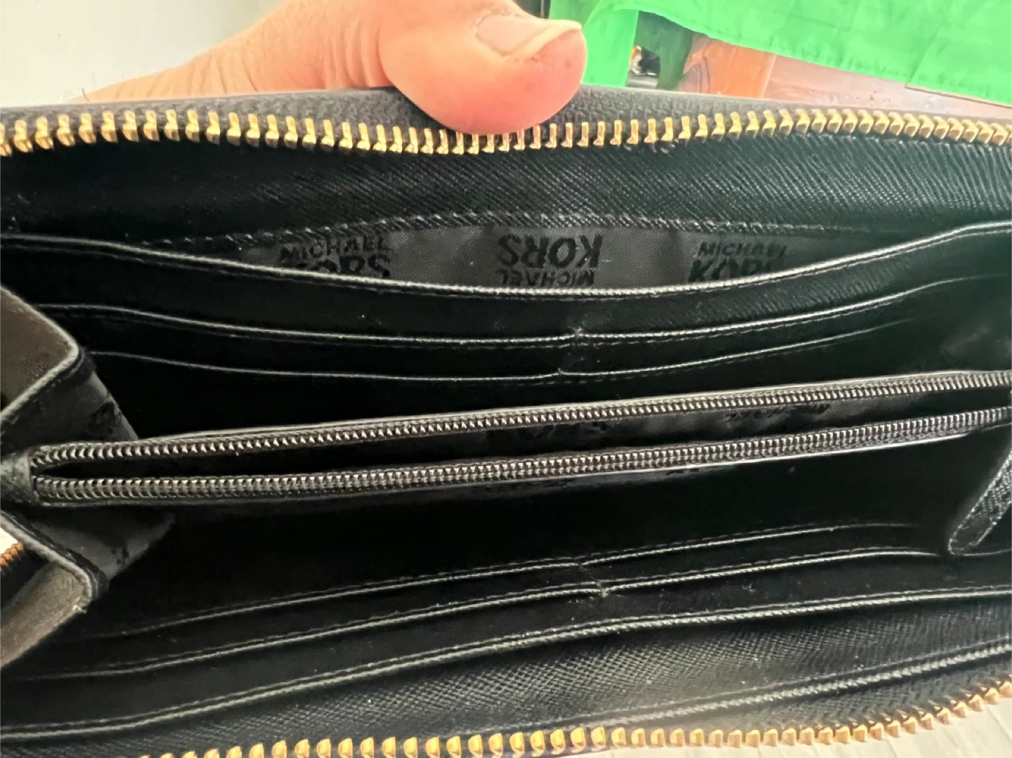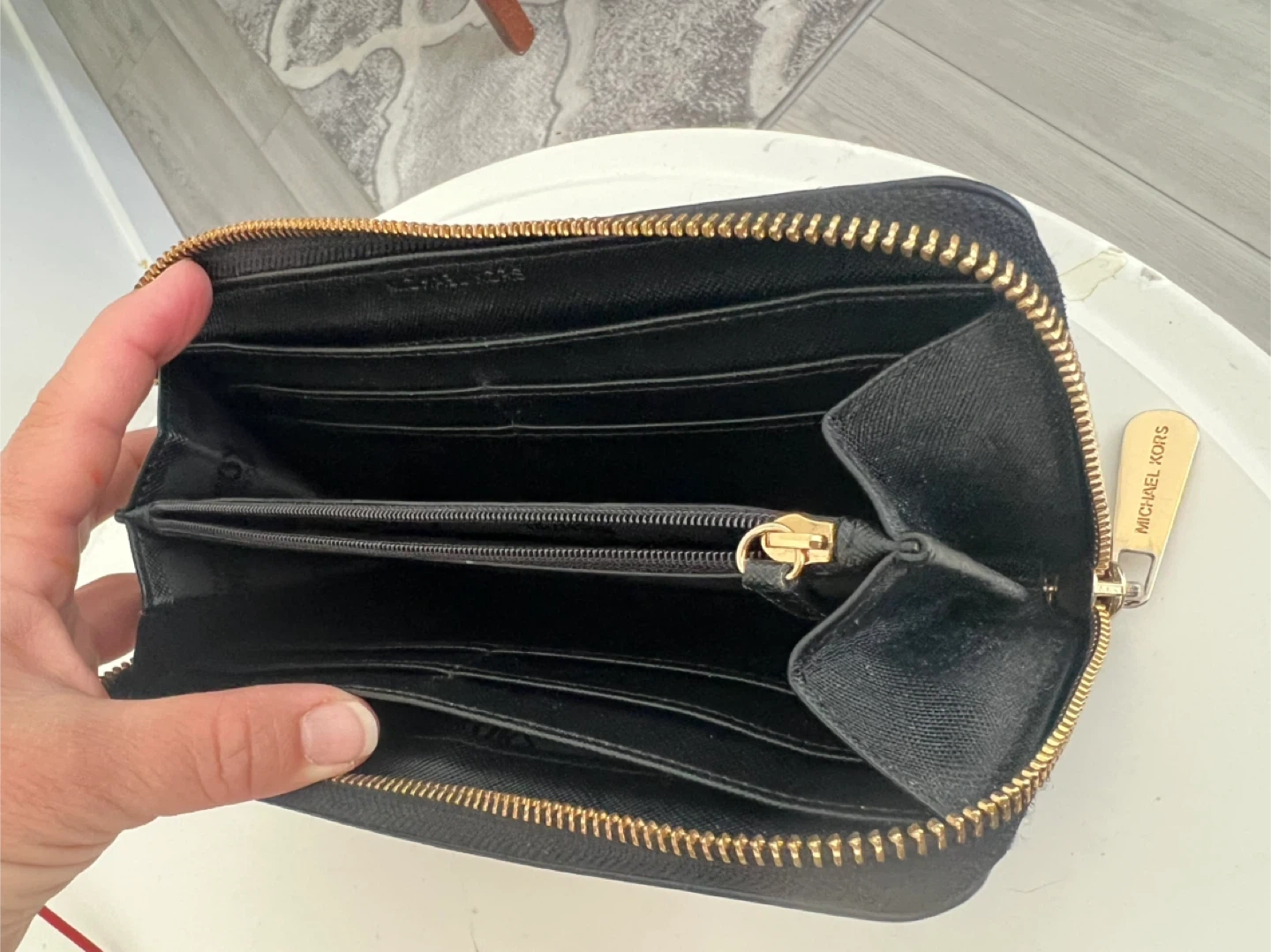 This is a Michael Kors zip-around wallet. It features the signature MK pattern in black with gold-tone hardware. The interior has multiple card slots and compartments for organization. UAE only once over 300 when I buy it in cross iron mall very beautiful a lot of rooms