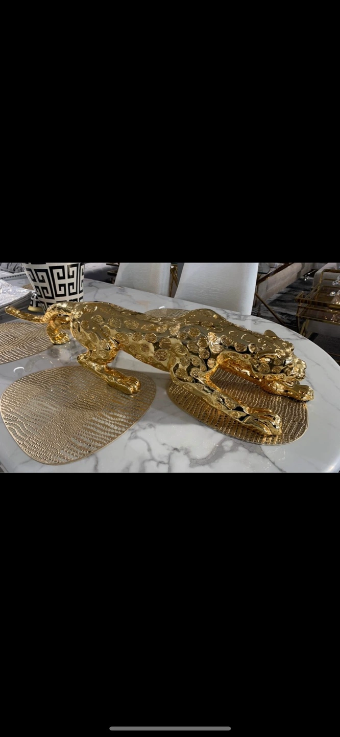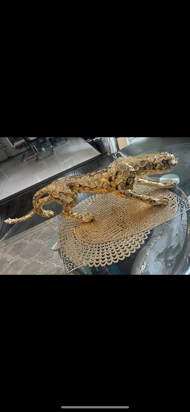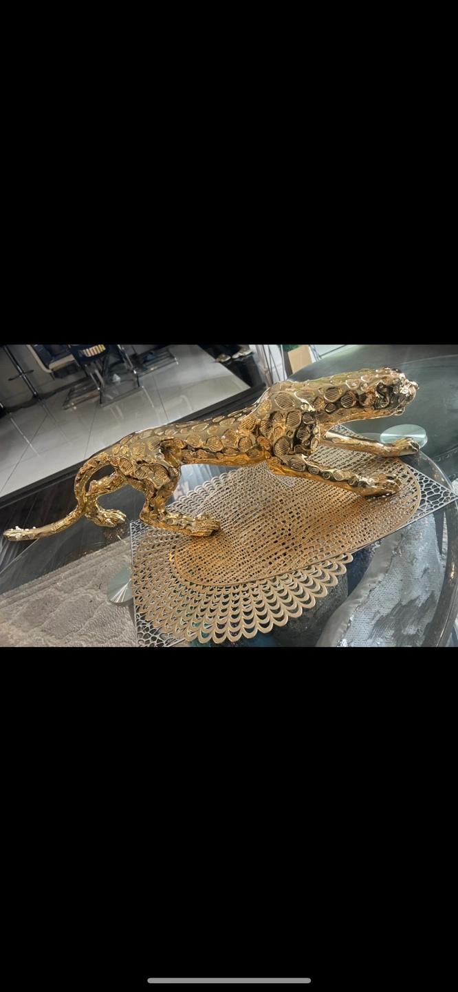 This striking gold leopard sculpture adds a touch of elegance to any space. Crafted from metal with a unique, textured finish, it's a statement piece for your home decor. Includes original packaging for safe transport.