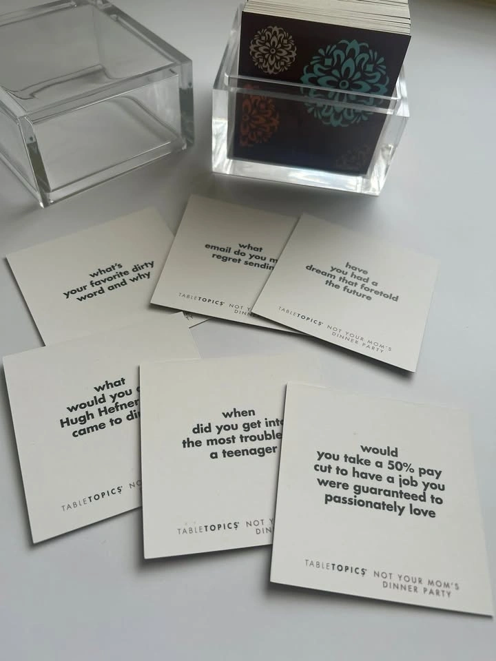 Table Topic: Not Your Mom’s Dinner Party Edition is a fun conversation card game filled with entertaining, thought-provoking, and sometimes hilarious questions that get everyone talking and laughing.