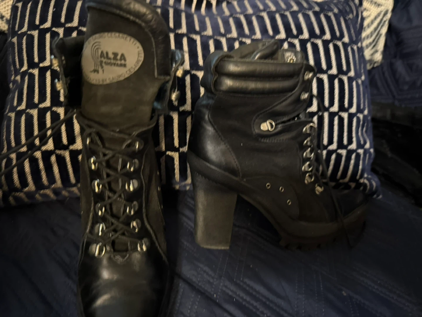 These black leather boots are from Cesaretti. They feature a lace-up front and a chunky heel. These boots are made for walking in style! Size 6