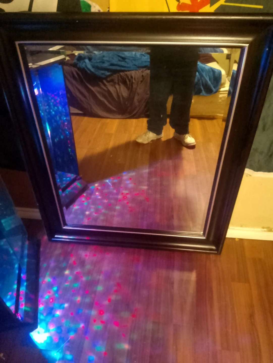 A black framed mirror is available. It has a reflective surface and a sturdy frame. This mirror would be useful for checking your appearance or adding to your home decor. It's a practical item for any room!