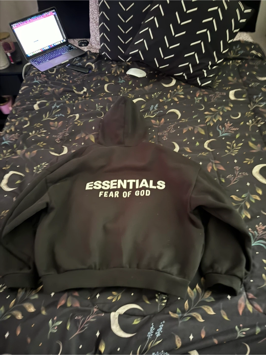 Black Fear of God Essentials hoodie. This comfortable hoodie features the brand's logo on the back and chest. It's made from soft material for everyday wear.