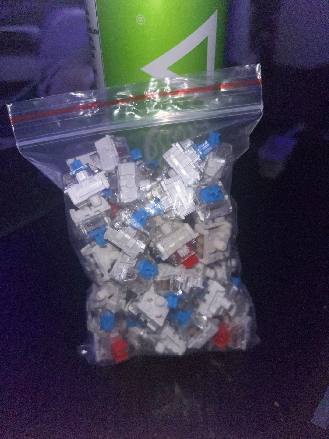 Bag of mechanical keyboard switches. Includes blue, and some red variants. Good for custom keyboard builds or repairs! Comes in a resealable plastic bag.