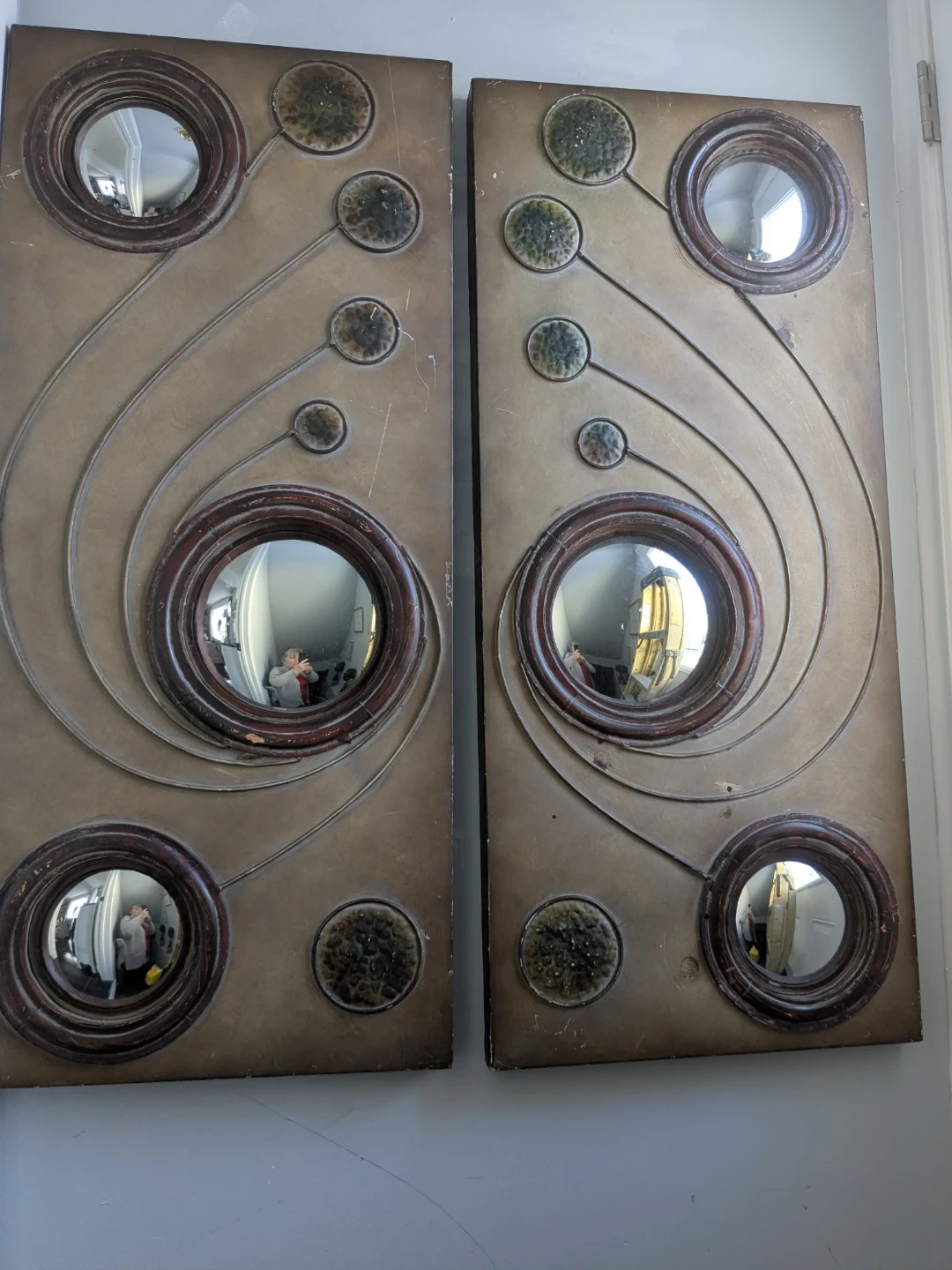 This pair of wall mirrors features a unique mid-century modern design. Each mirror is set within a metallic frame with circular decorative elements. They're a stylish addition to any living room or hallway!