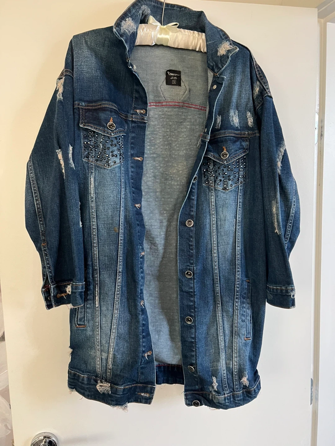 Selling a Raw Denim long denim jacket in size small. It features a distressed design with stud detailing on the front pockets and back. Great for adding a unique touch to your wardrobe!
