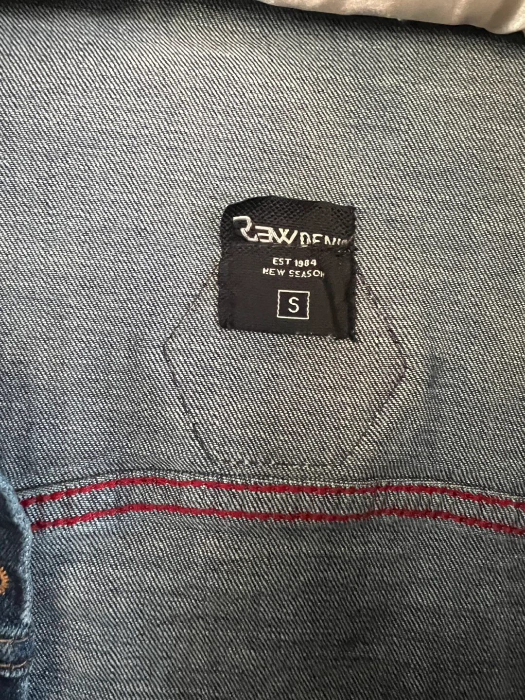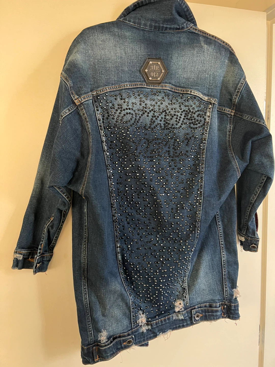 Selling a Raw Denim long denim jacket in size small. It features a distressed design with stud detailing on the front pockets and back. Great for adding a unique touch to your wardrobe!